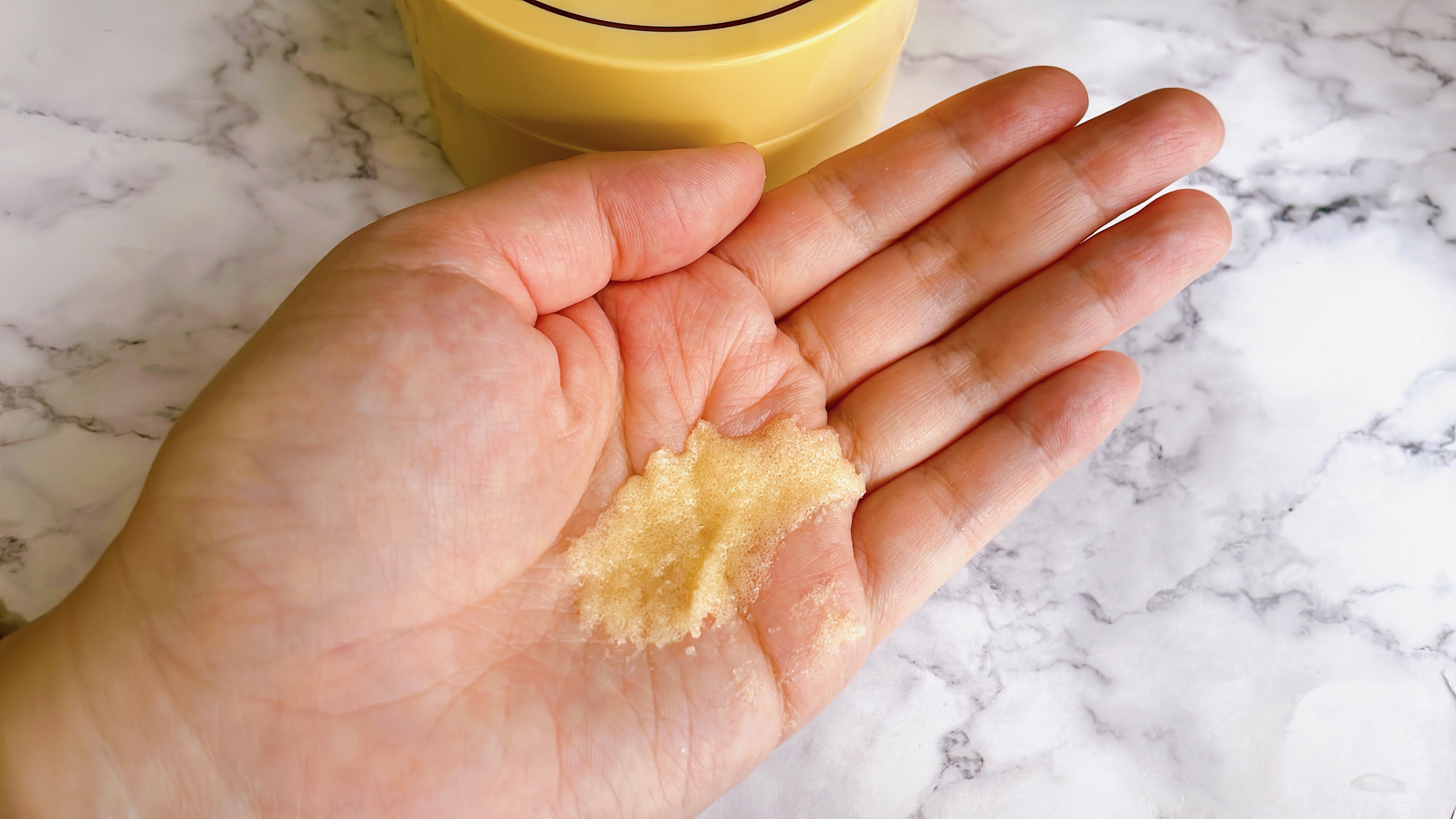 手に取ると、スクラブが入っているのがわかります。 洗い上がりは、乾燥するかな?と気になっていましたが、しっとりとしていたので驚きました^^ 馴染ませていくと、柑橘系のさわやかな香りがふわっと広がるので、癒されます。
