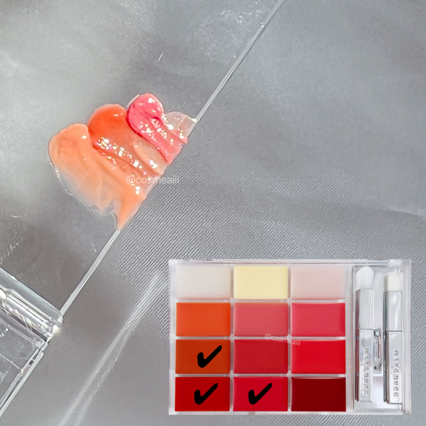 Qoo10で999円という破格で売られているリップパレット。持ち運びも塗り直しも面倒なイメージがあってパレットタイプのリップってどうなんだろう…🤔💭と思ってたんだけど安く売られてたら買うよね😂 配色がどストライクすぎる。ラメ入りはしっかりキラキラ✨で塗り広げてもしっかり存在感があってとても可愛い。 薄型パレットでチップもブラシもひとつになってるから案外持ち運びもラクでマジで買ってよかったのよね〜