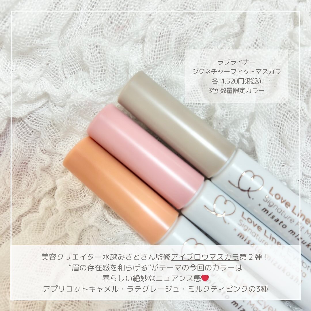- 〈限定発売〉美容クリエイター水越みさとさん監修アイブロウマスカラ第2弾。 ・“眉の存在感を和らげる”ことをテーマに、春らしい絶妙なニュアンス感カラー。 ・地肌につきにくく塗りやすい角度つき極小ブラシ採用。 ・1本1本色づき自然になじむアイブロウマスカラ。 ミルクティピンク…温かみのある愛されピンクブラウン ラテグレージュ…ソフトな印象を与えるこなれグレーベージュ アプリコットキャメル…自然な抜け感が出るおしゃれオレンジブラウン