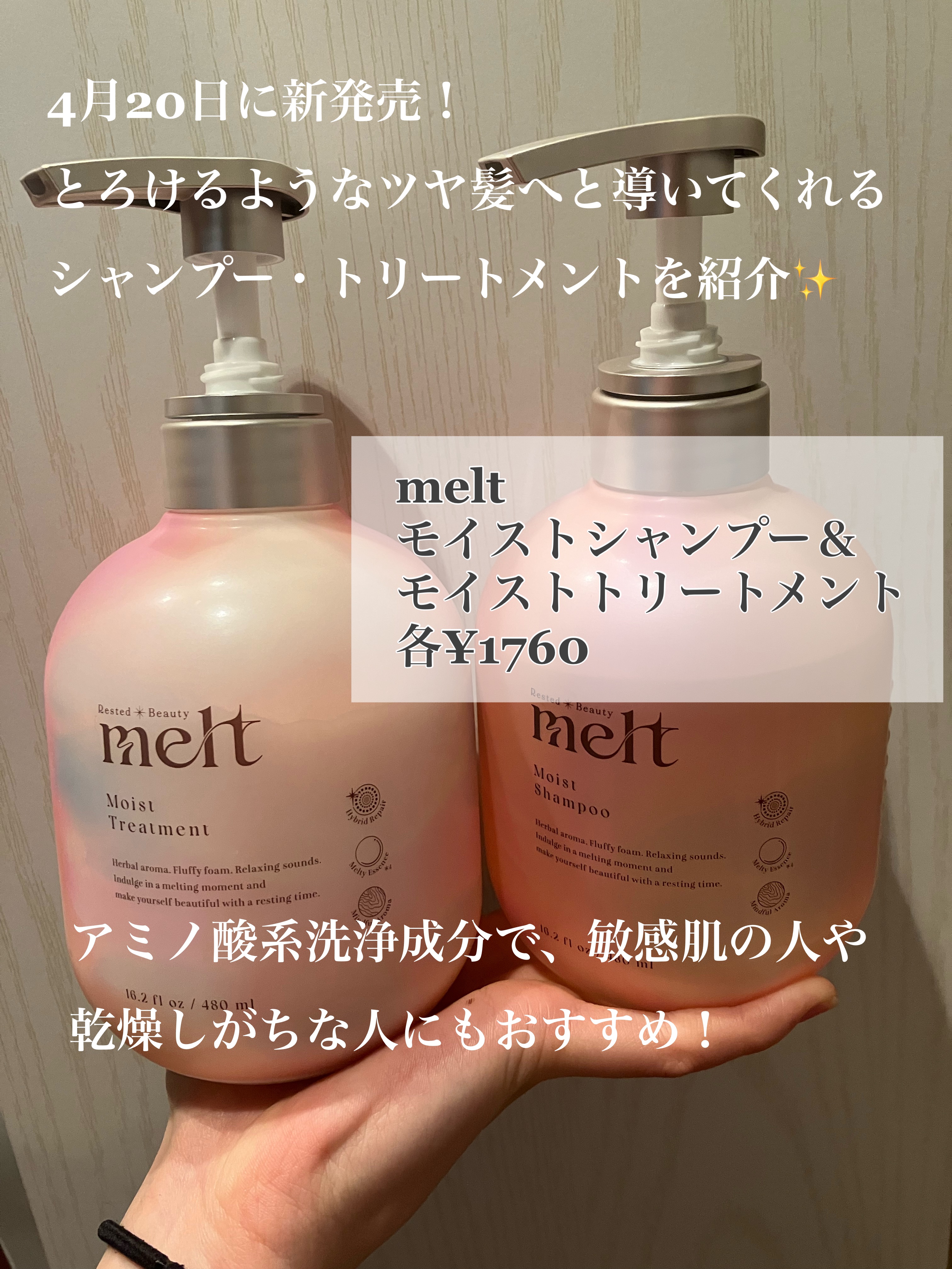 【#melt】#モイストシャンプー・トリートメントこだわりの美容液成分を配合したハイブリットリペア処方✨️髪に優しいアミノ酸系洗浄成分が嬉しい♡髪表面と内側を同時に補修し、みずみずしくやわらかいとろけるようなツヤ髪へ導いてくれます!時を忘れる...
