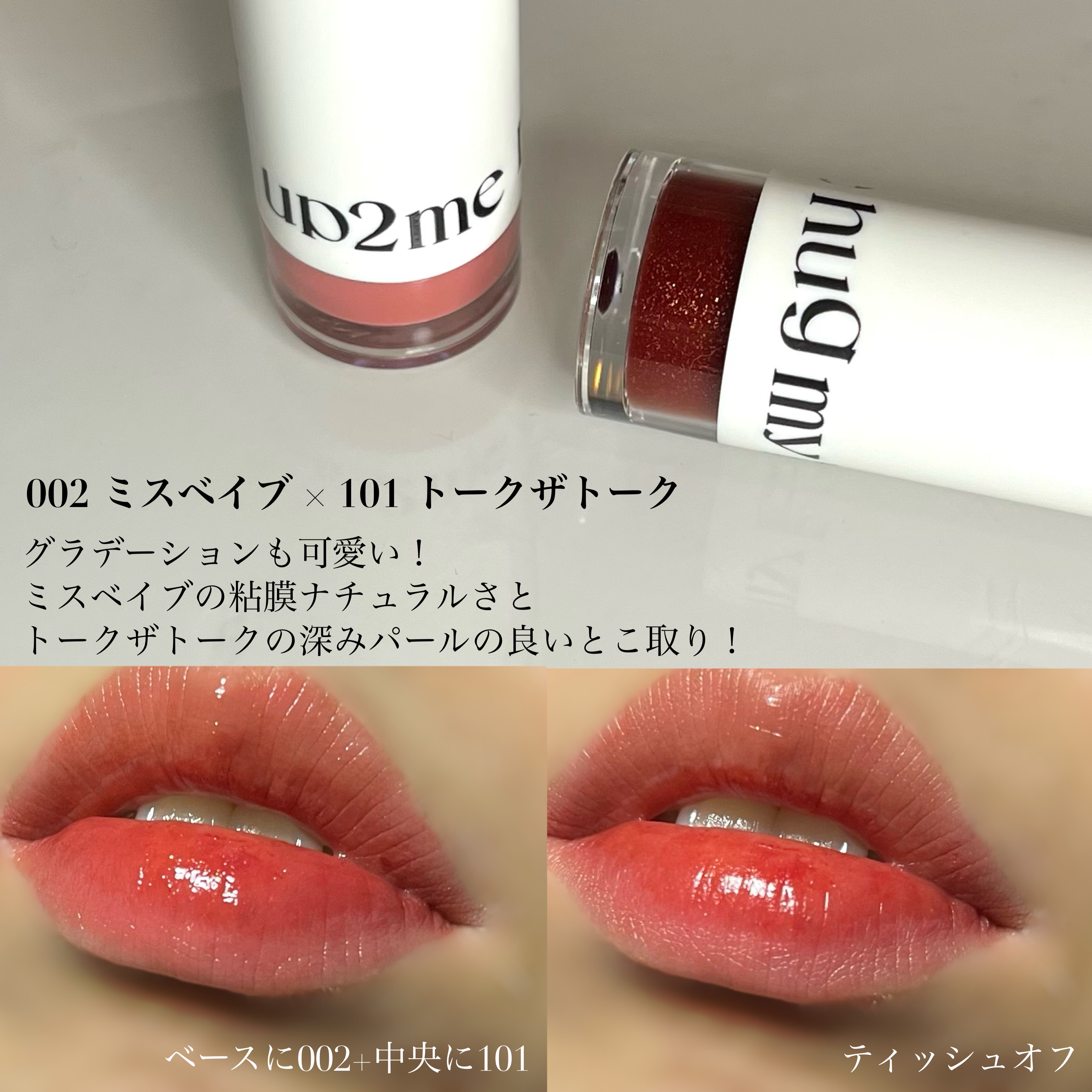 ミニリップティントセットの2カラーでグラデーションを作ってみたら、すっっごく可愛い! メメントモリの調整次第で雰囲気もかなり変わります。 持ち歩きにも便利なミニサイズも、ちいちゃくて可愛いんです!