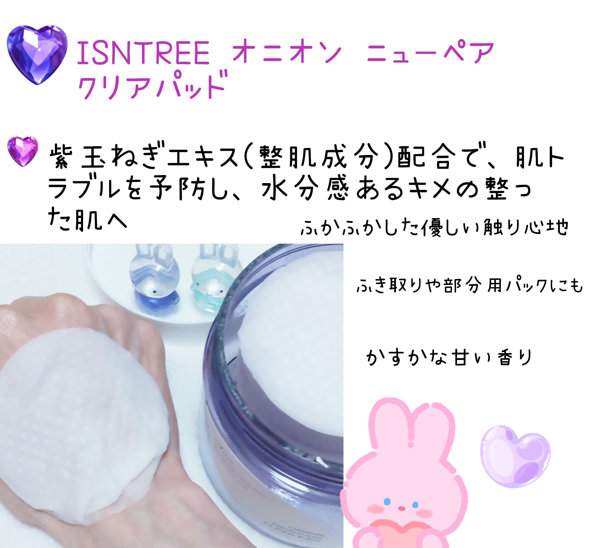 Isntreeさまのプレゼント企画に当選しいただきました。トラブル跡をケアするオニオンニューペアライン🧅▶オニオンニューペアクリアパッド7層にもなるパッドで、厚みがあり2~3枚割くことができます。ふき取りとしても良いですが私は割いてパックに使...