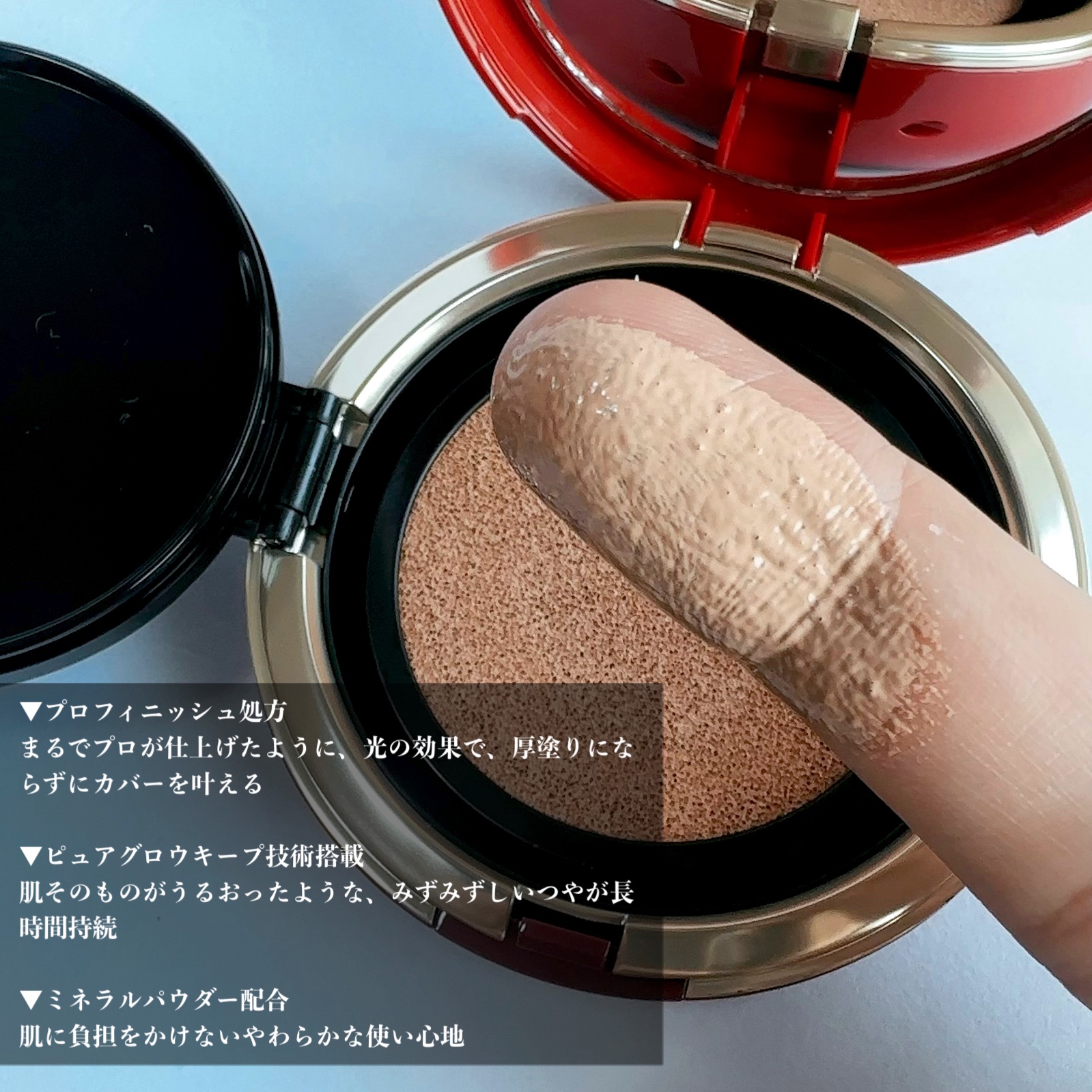 - 1回ポンとするだけで、気になる毛穴・色ムラ・ニキビ跡を瞬間カバーするのに、厚塗り感なし!うるんだ つや肌が1日中※2続く、クッションファンデーション ※2 13時間化粧持ち(つや・化粧崩れのなさ・カバー力)持続データ取得済み(当社調べ、効果には個人差があります。) ○まるでプロが仕上げたように、光の効果で、厚塗りにならずにカバーを叶えます。 -プロフィニッシュ処方 ○肌そのものがうるおったような、みずみずしいつやが長時間持続します。 -ピュアグロウキープ技術搭載 ○ヒアルロン酸(保水)配合 ○乾燥を防いで、うるおいが長時間持続します。 ○肌に負担をかけないやわらかな使い心地です。 -肌あれ防止ミネラルパウダー配合 ○SPF50+・PA+++ ○無香料・ニキビのもとになりにくい処方・アレルギーテスト済み ※全てのかたにニキビができない・アレルギーが起きないというわけではありません。 ■仕上がりイメージ 1回ポンとするだけで瞬間カバー。 ※仕上がりイメージ(効果には個人差があります) <使用法> ●クッション面に専用パフを数回押しあてて適量をとります ●ほおの高い部分から外側に向かって、やさしくポンポンとなじませます。さらにカバーしたい場合は、もう一度パフに少量をとり、ポンポンと重ねづけします 2024年3月21日(木)先行発売・2024年5月21日(火)全国発売
