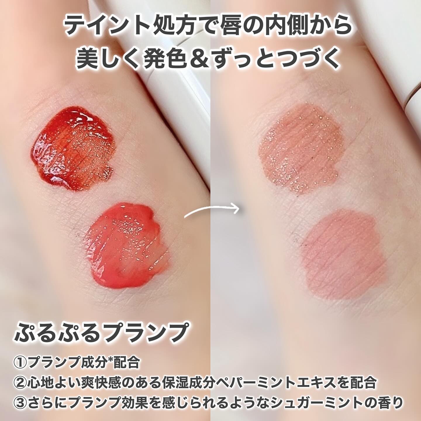 - ぽっと染まった唇、ぎゅっとハグして離さない。つやつやジェル膜がつけたての色を守り、きれい発色つづくプランプ*リップ *メイク効果