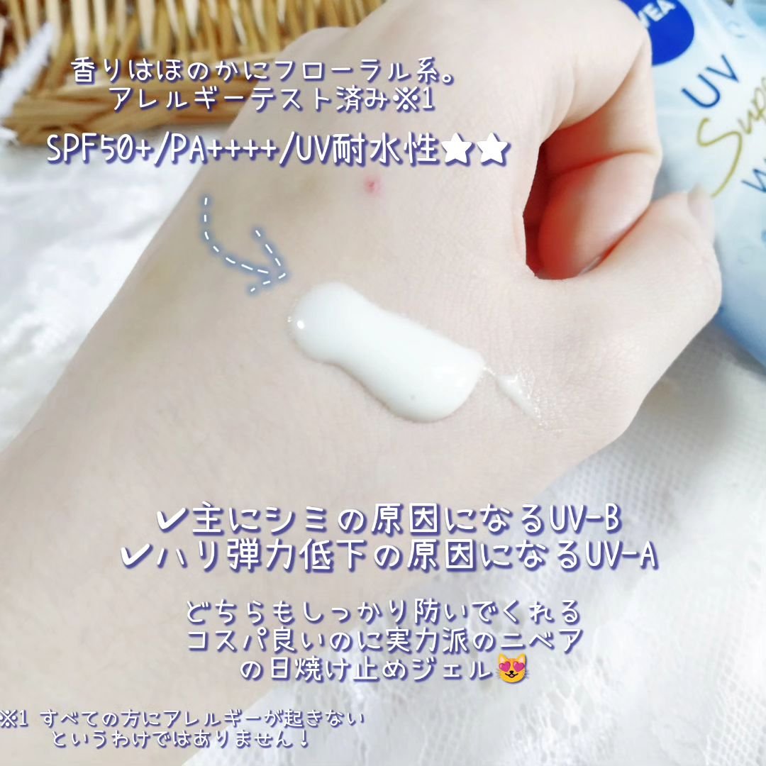 - 圧倒的にみずみずしい!(*1)消えるようになじむ 日やけ・乾燥予防UV ●圧倒的にみずみずしい!(*1) 消えるようになじむ みずみずしいジェルまたはエッセンスが全身にのび広げられ、消えるように素早くなじみます。肌と一体化するような軽さで、べたつきが気にならない素肌っぽい快適な使い心地。 ●SPF50+/PA++++/UV耐水性★★ 強烈紫外線から素肌をしっかりまもる。主にシミの原因となるUV-Bも、ハリ・弾力低下の原因となるUV-Aもしっかり防ぎます。 ●汗・水に強い 汗・水に強く落ちにくい。汗・水に触れても強烈紫外線をカットします。海、プール、スポーツ、レジャー、強い日差しの外出時にもおすすめです。 ●肌にうるおいを与えて透明感あふれる素肌へ うるおいによる透明感を追求した厳選成分クリアウォーターα(保湿)(*3)配合の化粧水ベース70%(*4)処方で、素肌を乾燥からまもります。 (*1) ニベアUVシリーズSPF50+/PA++++製品内における使用感 (*3) マンニトール、浸透(※)型ヒアルロン酸(加水分解ヒアルロン酸)、センチフォリアバラ花水、PG (※)角層まで (*4) 水(基剤)+クリアウォーターα(保湿)のこと 〇スーパーウォータープルーフ 〇せっけんで落とせる(専用クレンジング不要) 〇顔・からだ用 〇化粧下地に使える 〇鉱物油フリー、合成着色剤フリー、パラベンフリー、パウダーフリー 〇優しいほのかなフローラルアロマの香り 〇アレルギーテスト済み(すべての方にアレルギーが起こらないというわけではありません)