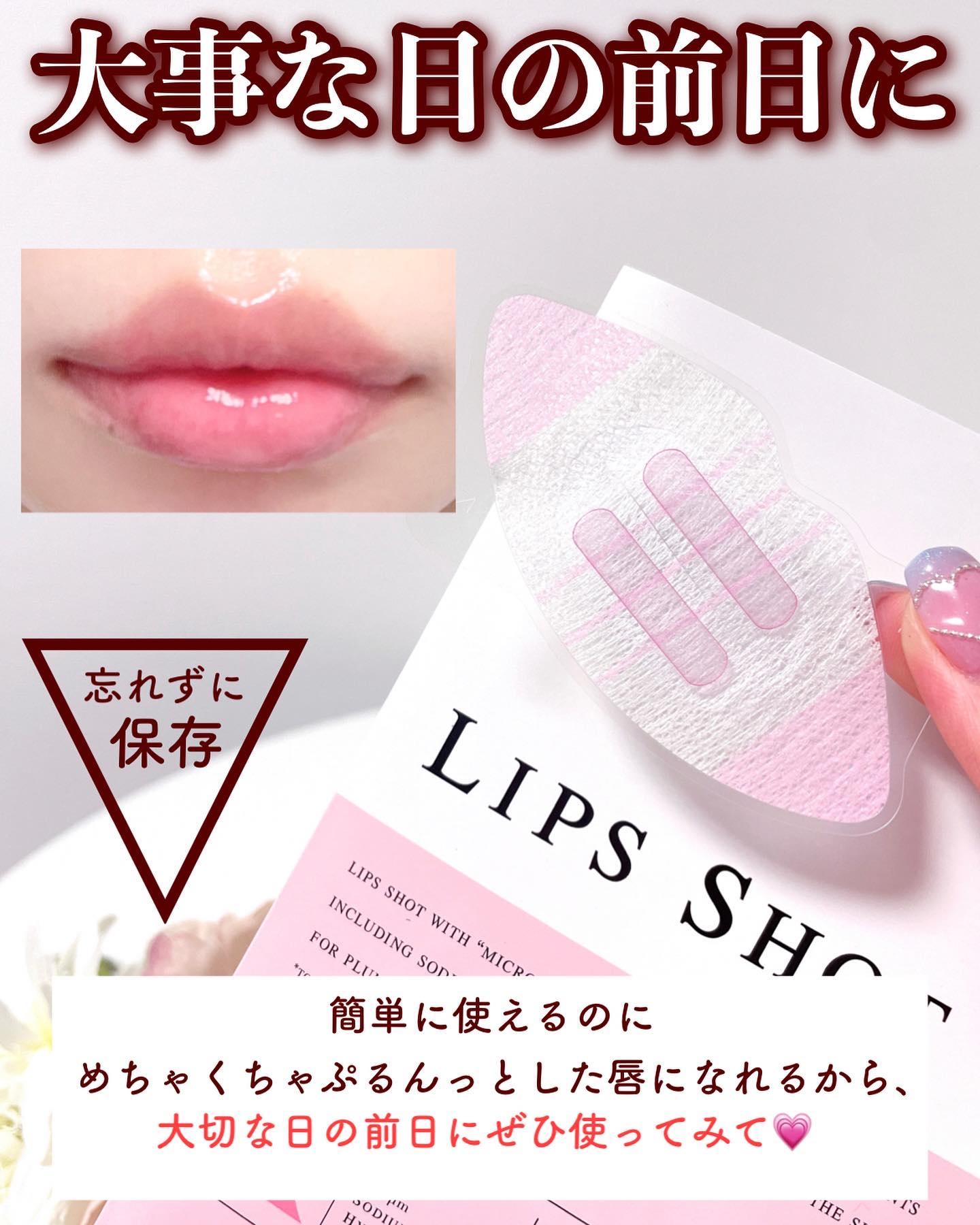 - LIPS SHOTは唇を自然にふっくらさせる唇専用パックです。唇をふっくらさせるヒアルロン酸Naなどのプランプ成分を、針状に結晶化した独自開発のマイクロニードルで、塗るだけでは届かないプランプ成分を唇の角質層までダイレクトに届けることができます。 [セット内容] ・モットラボ リップパック(シート状美容液/1回分) ・モットラボ プランプエッセンス(唇用美容液/2g)