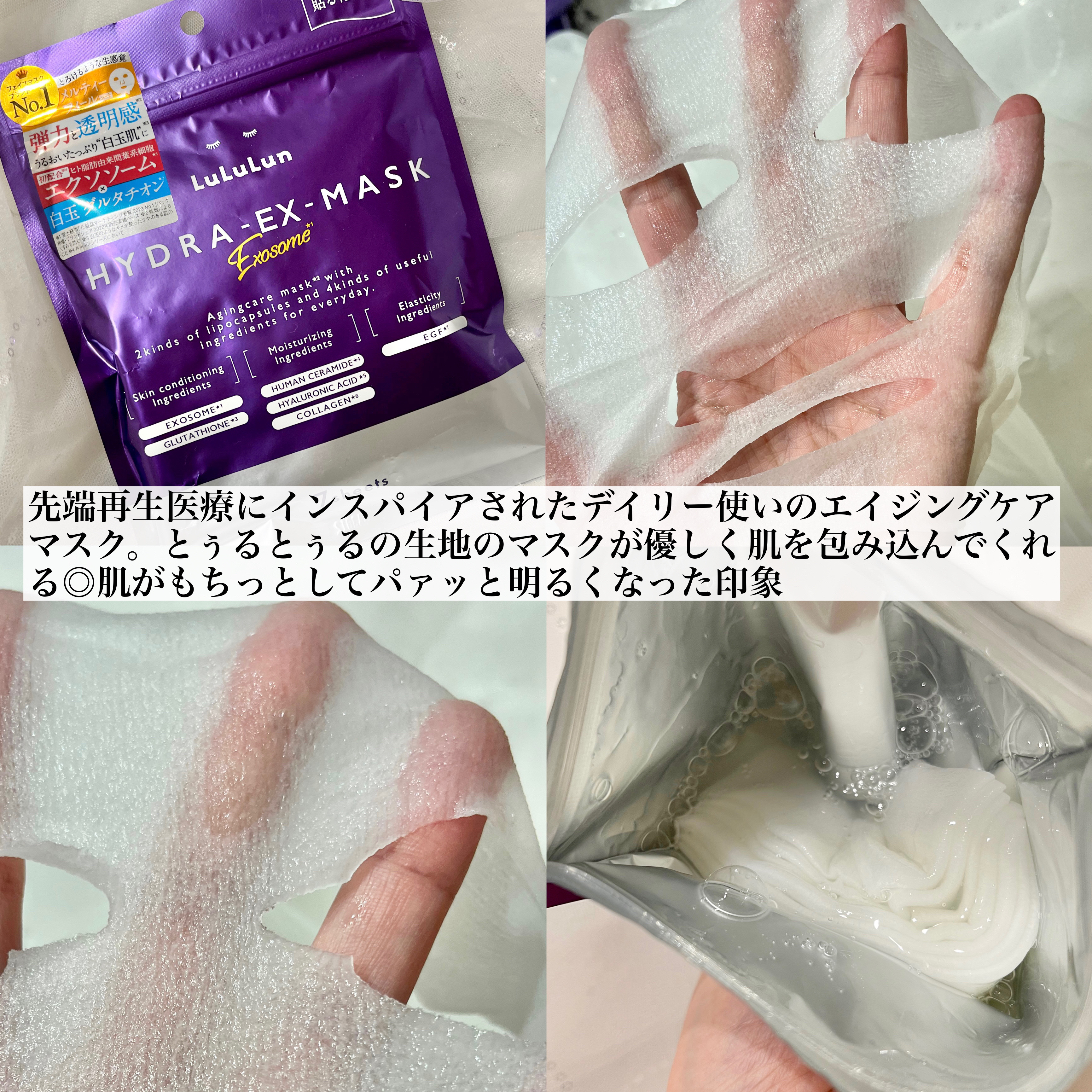 バズりすぎて今も売り切れや購入制限続出のルルルン ハイドラ EX マスク🤍 先端再生医療にインスパイアされたデイリーエイジングケアマスクで、日本製ヒト脂肪由来間葉系細胞エクソソームと白玉グルタチオンという今話題の成分が配合されています🔎 とろけるような柔らかいシートでつけると気持ちよくて、さすがルルルンとなりました🥰 しっかり保湿して透明感のある肌に ルルルン共通のいいところはそのままに、肌のハリツヤケアができてこの価格はバズるのも納得です💯
