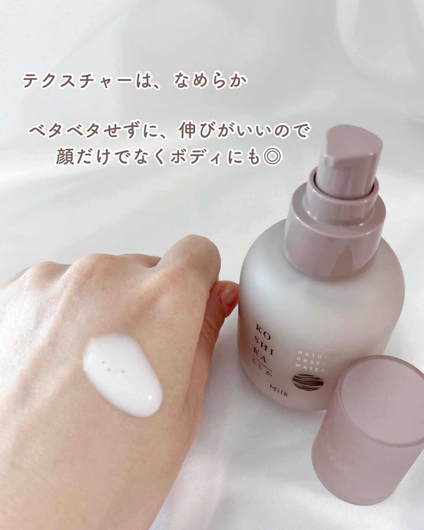するーっと伸びて肌に馴染みやすいです😆 マットな素材のボトルが手にフィットし、シンプルなデザインで素敵です✨✨ 軽いつけ心地で、べたつかないので使いやすいです。 お顔だけでなく、全身に使えるので、ボディミルクとして使えるのもいいね♥️ ぷるんとしていて、すーっと肌に馴染みます。 オールインワンなので忙しい時に嬉しいね♥️