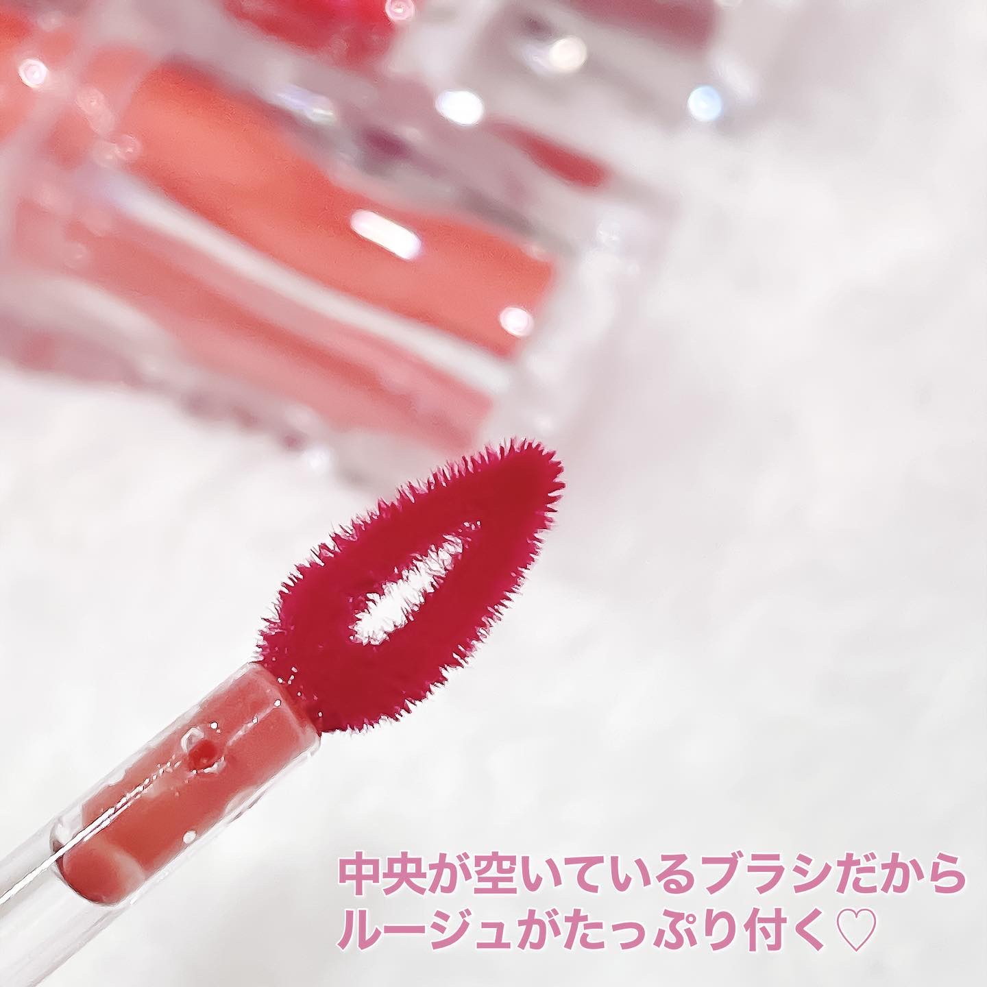 波打つようなパケがおしゃれで可愛いティントリップです💄✨ つややかでうるっとした水光感のある仕上がりで、一気に華やかな唇になれます💖 まるで塗る宝石のようなグリッターで、韓国メイクには欠かせないキラキラ感を演出してくれます🌟 付属のブラシがとっても使いやすく、ピンポイントにホロを乗せたい時に便利です🥰