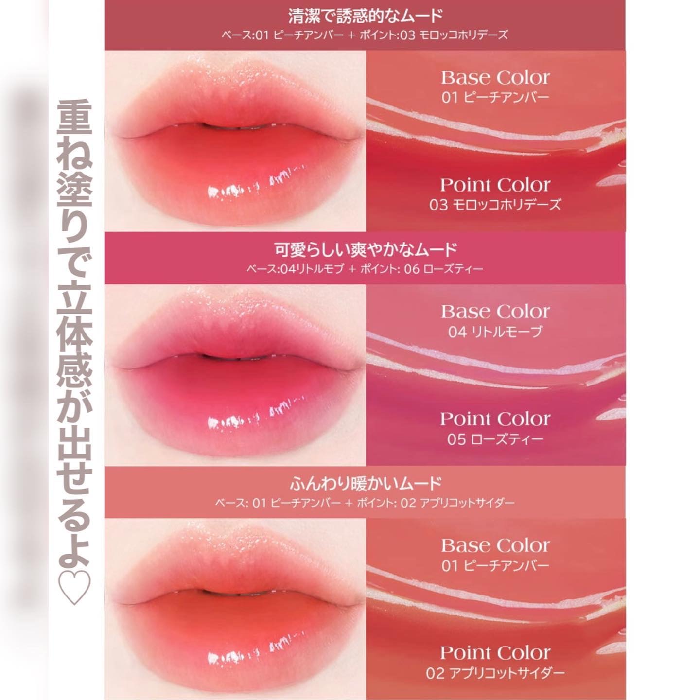 - <01. ピーチアンバー> 水、リンゴ酸ジイソステアリル、ビスジグリセリルポリアシルアジペート-2、ジフェニルシロキシフェニルトリメチコン、ジフェニルジメチコン、水添ポリイソブテン、BG、グリセリン、1,2-ヘキサンジオール、セテアレス-20、セテアリルアルコール、セチルPEG/PPG-10/1ジメチコン、(アクリル酸ヒドロキシエチル/アクリロイルジメチルタウリンNa)コポリマー、ポリソルベート60、フェノキシエタノール、スクワラン、香料、エチルヘキシルグリセリン、EDTA-2Na、イソステアリン酸ソルビタン、水酸化Al、ポリアクリル酸アンモニウム、ホホバ種子油、月見草油、アボカド油、モモ果実エキス、ステアリン酸Na、クエン酸、テトラ(ジ-t-ブチルヒドロキシヒドロケイヒ酸)ペンタエリスリチル、クダモノトケイソウ果実エキス、ヤエヤマアオキ果実エキス、ミルシアリアデュビア果実エキス、アンマロク果実エキス、ヒポファエラムノイデス果実エキス、テルミナリアフェルジナンジアナ果実エキス、酸化チタン、黄5、赤227、赤104(1)、黄4、青1 <02.アプリコットサイダー> 水、リンゴ酸ジイソステアリル、ビスジグリセリルポリアシルアジペート-2、ジフェニルシロキシフェニルトリメチコン、水添ポリイソブテン、ジフェニルジメチコン、BG、グリセリン、1,2-ヘキサンジオール、セテアレス-20、セテアリルアルコール、セチルPEG/PPG-10/1ジメチコン、(アクリル酸ヒドロキシエチル/アクリロイルジメチルタウリンNa)コポリマー、ポリソルベート60、フェノキシエタノール、スクワラン、香料、エチルヘキシルグリセリン、EDTA-2Na、イソステアリン酸ソルビタン、アボカド油、ホホバ種子油、月見草油、モモ果実エキス、ステアリン酸Na、クエン酸、テトラ(ジ-t-ブチルヒドロキシヒドロケイヒ酸)ペンタエリスリチル、アンマロク果実エキス、クダモノトケイソウ果実エキス、ヒポファエラムノイデス果実エキス、テルミナリアフェルジナンジアナ果実エキス、ヤエヤマアオキ果実エキス、ミルシアリアデュビア果実エキス、酸化チタン、黄5、赤227、赤104(1)、青1 <03.モロッコホリデーズ> 水、リンゴ酸ジイソステアリル、ビスジグリセリルポリアシルアジペート-2、ジフェニルシロキシフェニルトリメチコン、ジフェニルジメチコン、水添ポリイソブテン、BG、グリセリン、1,2-ヘキサンジオール、セテアレス-20、セテアリルアルコール、セチルPEG/PPG-10/1ジメチコン、(アクリル酸ヒドロキシエチル/アクリロイルジメチルタウリンNa)コポリマー、ポリソルベート60、フェノキシエタノール、スクワラン、香料、エチルヘキシルグリセリン、EDTA-2Na、イソステアリン酸ソルビタン、水酸化Al、ポリアクリル酸アンモニウム、ホホバ種子油、月見草油、アボカド油、モモ果実エキス、ステアリン酸Na、クエン酸、テトラ(ジ-t-ブチルヒドロキシヒドロケイヒ酸)ペンタエリスリチル、クダモノトケイソウ果実エキス、ヤエヤマアオキ果実エキス、ミルシアリアデュビア果実エキス、アンマロク果実エキス、ヒポファエラムノイデス果実エキス、テルミナリアフェルジナンジアナ果実エキス、酸化チタン、黄5、赤227、赤104(1)、青1、黄4 <04. リトルモーブ> 水、リンゴ酸ジイソステアリル、ビスジグリセリルポリアシルアジペート-2、ジフェニルシロキシフェニルトリメチコン、ジフェニルジメチコン、水添ポリイソブテン、BG、グリセリン、1,2-ヘキサンジオール、セテアレス-20、セテアリルアルコール、セチルPEG/PPG-10/1ジメチコン、(アクリル酸ヒドロキシエチル/アクリロイルジメチルタウリンNa)コポリマー、ポリソルベート60、フェノキシエタノール、スクワラン、香料、エチルヘキシルグリセリン、EDTA-2Na、イソステアリン酸ソルビタン、水酸化Al、ポリアクリル酸アンモニウム、ホホバ種子油、月見草油、アボカド油、モモ果実エキス、ステアリン酸Na、クエン酸、テトラ(ジ-t-ブチルヒドロキシヒドロケイヒ酸)ペンタエリスリチル、クダモノトケイソウ果実エキス、ヤエヤマアオキ果実エキス、ミルシアリアデュビア果実エキス、アンマロク果実エキス、ヒポファエラムノイデス果実エキス、テルミナリアフェルジナンジアナ果実エキス、酸化チタン、赤227、赤104(1)、黄5、黄4、青1 <05.ローズティー> 水、リンゴ酸ジイソステアリル、ビスジグリセリルポリアシルアジペート-2、ジフェニルシロキシフェニルトリメチコン、ジフェニルジメチコン、水添ポリイソブテン、BG、グリセリン、1,2-ヘキサンジオール、セテアレス-20、セテアリルアルコール、セチルPEG/PPG-10/1ジメチコン、(アクリル酸ヒドロキシエチル/アクリロイルジメチルタウリンNa)コポリマー、ポリソルベート60、フェノキシエタノール、スクワラン、香料、エチルヘキシルグリセリン、EDTA-2Na、イソステアリン酸ソルビタン、水酸化Al、ポリアクリル酸アンモニウム、ホホバ種子油、月見草油、アボカド油、モモ果実エキス、ステアリン酸Na、クエン酸、テトラ(ジ-t-ブチルヒドロキシヒドロケイヒ