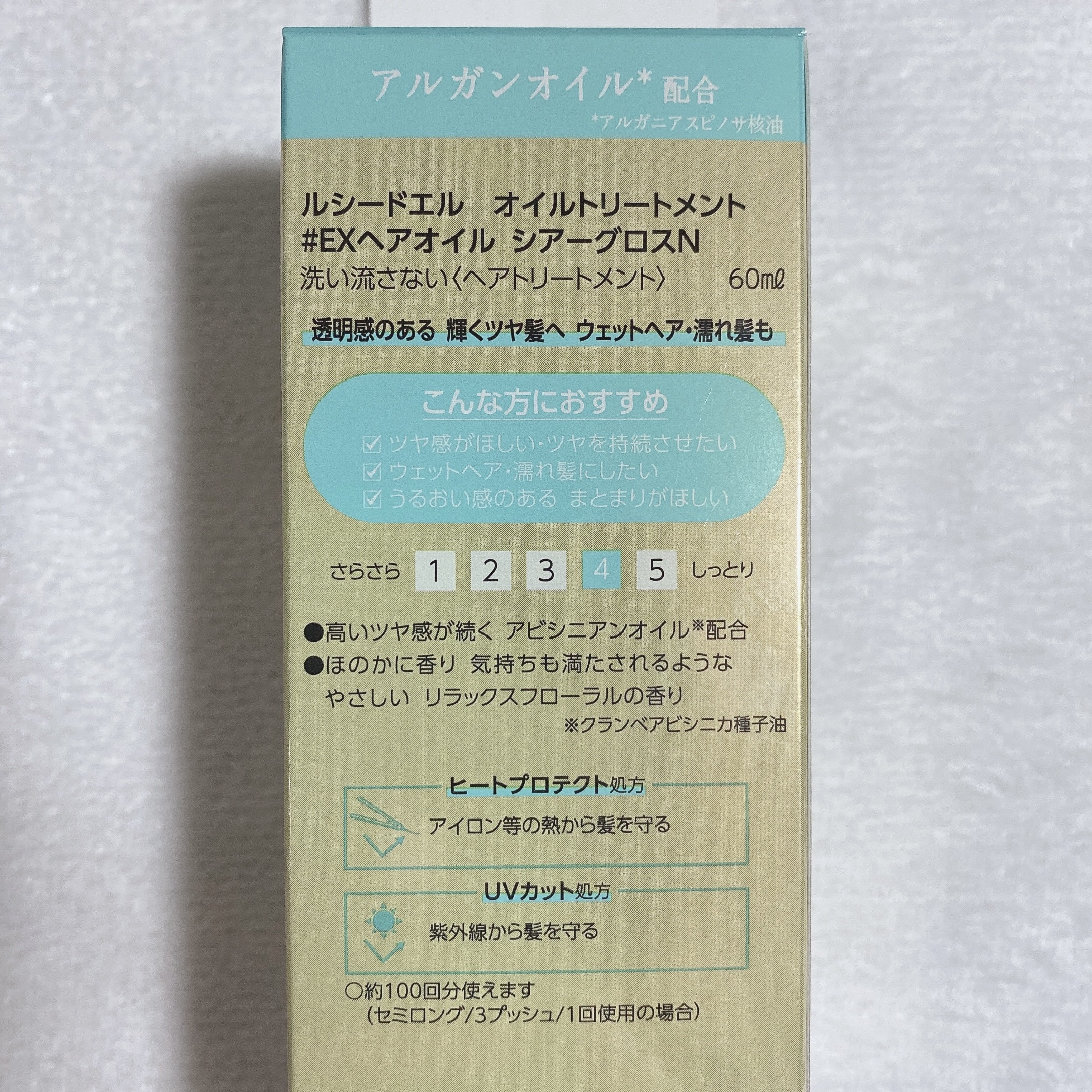 - ※2025年12月中旬〜順次パッケージと香りをリニューアル。尚、リニューアルにかかる返品交換等は承っておりません。 【アルガンリッチオイルシリーズ特徴】 超高圧プレス処理した天然アルガンオイル*1配合。 アルガンオイルが持つ保水力の高さと、サラッとした伸びなじみの良さを兼ね備え、芯からうるおいに満ちた心地よい髪に導くヘアオイルです。 なめらかなオイルの保水膜によって枝毛・切れ毛などが気になる髪のダメージを補修します。 フレッシュなフルーティノートにフリージアを合わせた、クリアフローラルの香り。 【 #EXヘアオイル シアーグロス特徴】 潤沢なツヤ髪へ導く透明感あふれるツヤタイプ。 高いツヤを与えるアビシニアンオイル*2を配合しているため、輝きに満ちたツヤが持続。 【こんな方におすすめ】 ●髪にツヤがない方。 ●ウェットヘア・濡れ感のあるスタイリングがしたい方。 ●うるおい感のあるまとまりが持続しない方。 *1 アルガニアスピノサ核油(保湿) *2 クランベアビシニカ種子油