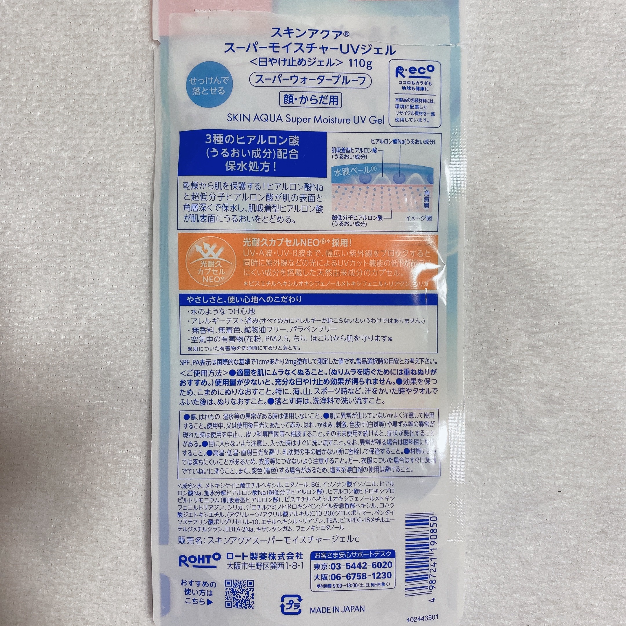 【スキンアクア】スーパーモイスチャージェルポンプタイプ購入しました。UV耐水性が書いてるので新しいバージョンかな?と思います。水のような軽いつけ心地で、ジェルタイプならではのうるおい感。顔にも身体にも使える万能UVで、SPF50+/PA+++...