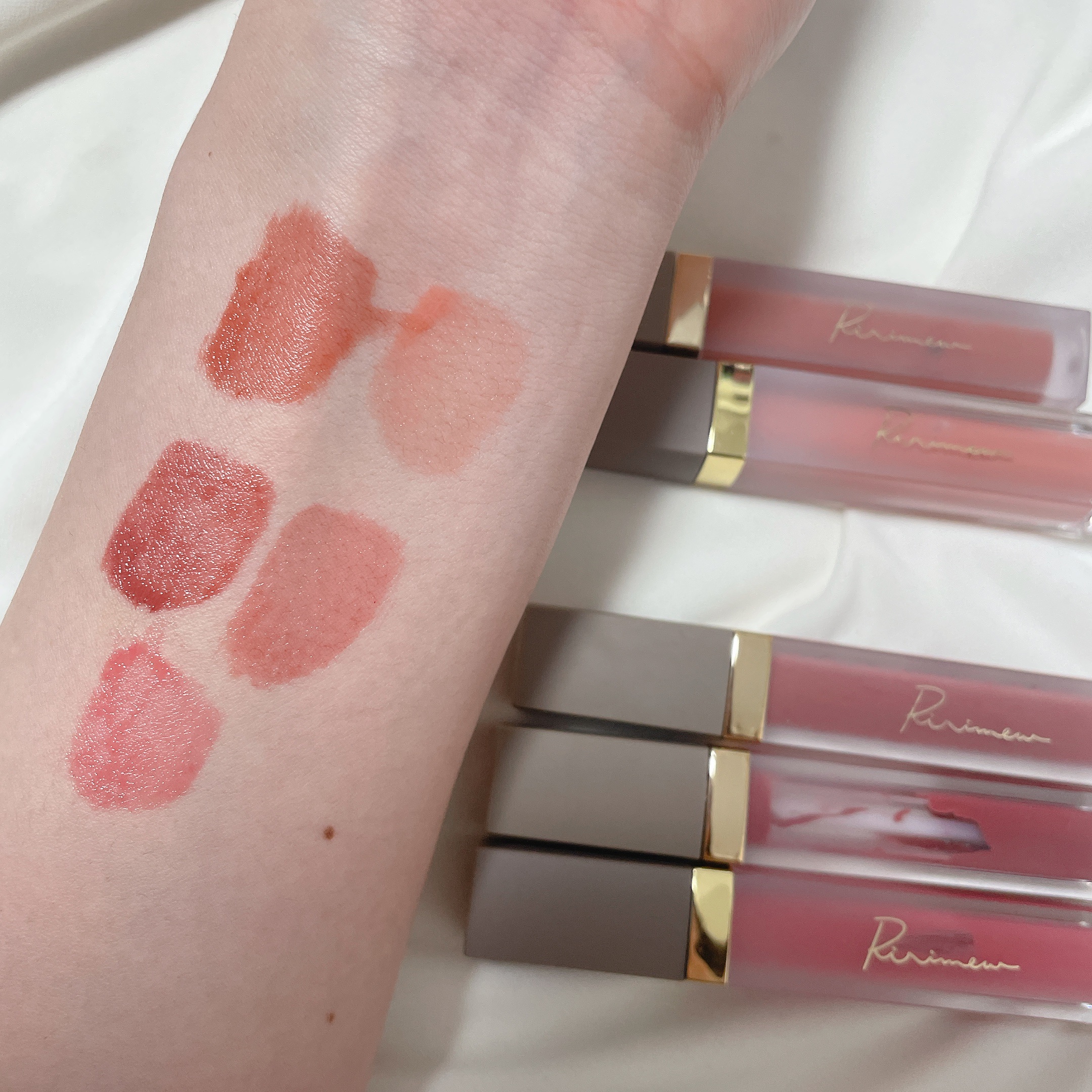 \Ririmewティント全色スウォッチ/Xのリリミュウ公式様のプレキャンにていただきました。すんごく可愛いケーキのような箱で届きました🎂💓Ririmewのティントは透け感あるタイプのミューテッドシアーティント濃密高発色のセンシュアルフィックス...