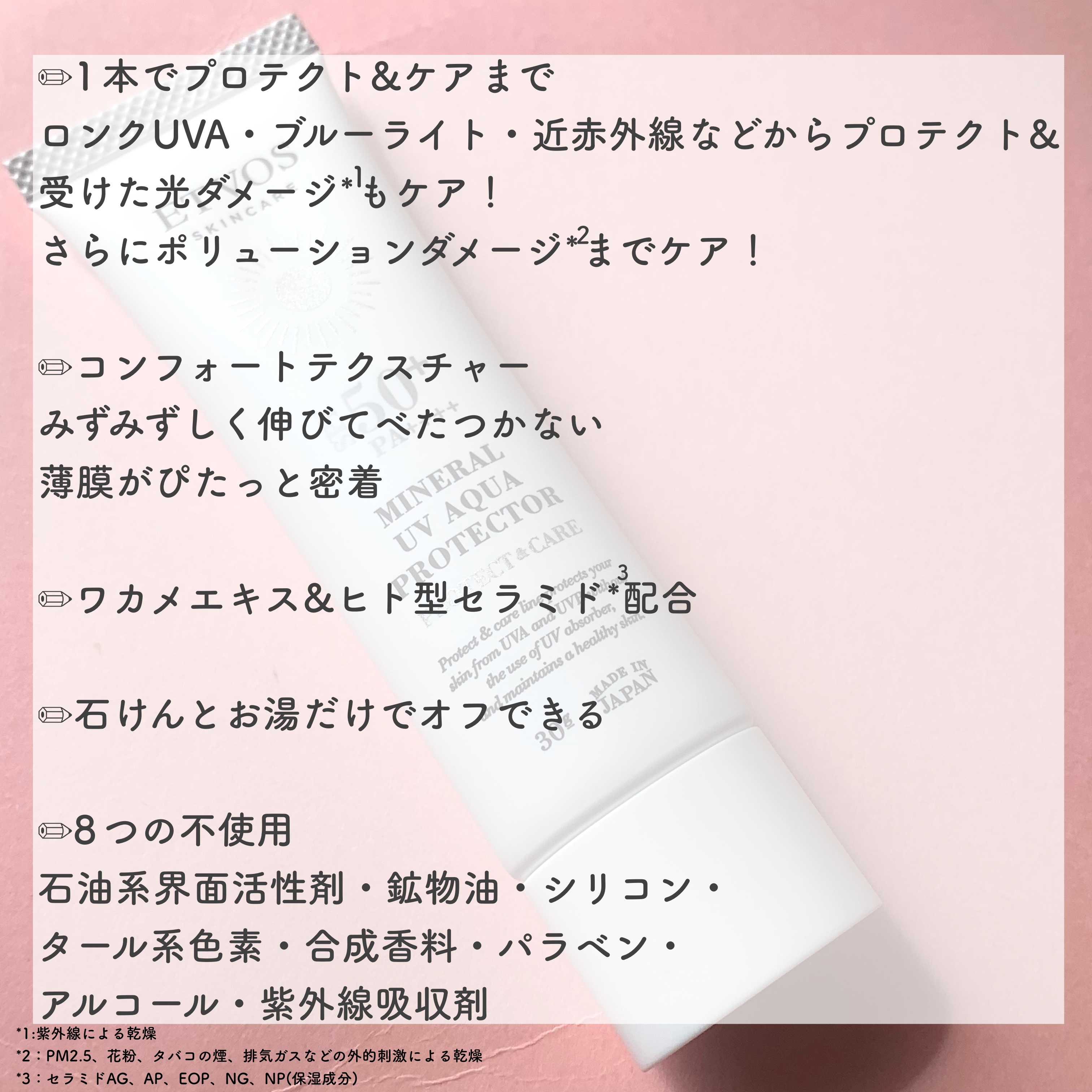 - 数量限定再販発売 SPF50+ PA++++ 敏感がゆえにゆらぎやすい肌を、紫外線からしっかり守ります。 さらに、日焼け止めとして紫外線カット効果はもちろん、やむなく受けてしまった光ダメージ*をケア。 薄膜が肌の上にのび広がっていくテクスチャーは、摩擦やベタつきが苦手な肌にも快適な、エトヴォスならではの感触です。 *紫外線による乾燥