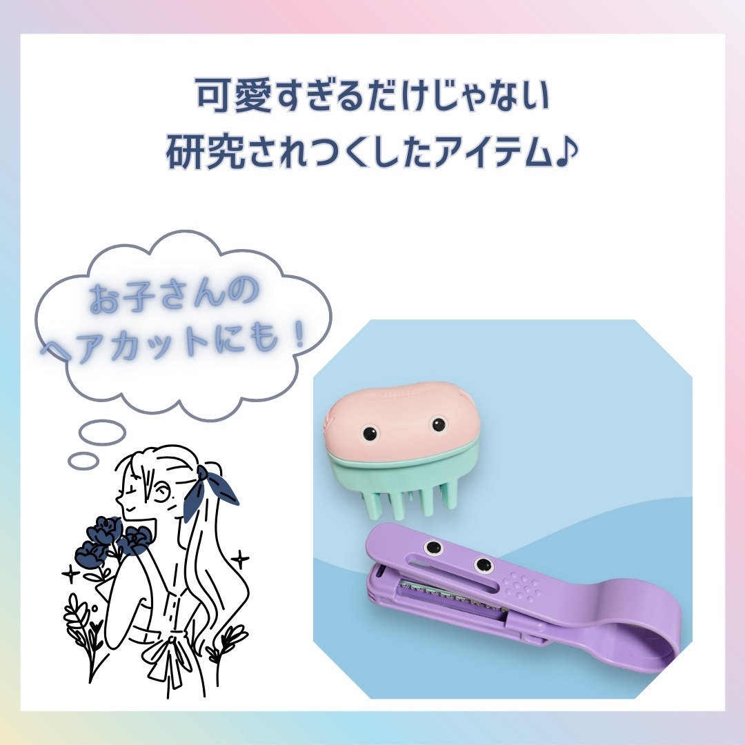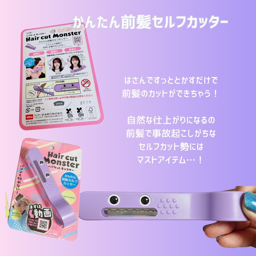 愛称は『ヘアカットモンスター』。商品には『目』がついており、髪をパクっと食べるところがまるでモンスターのよう。 ハサミより簡単におうちでセルフカットをコンセプトにプロの理美容業界で培ったヘアカットの知見を活かしたヘアカットモンスターを開発したんだそうです。 意外と簡単に使えるし、子供が、何これ?かわいい!って言ってました。