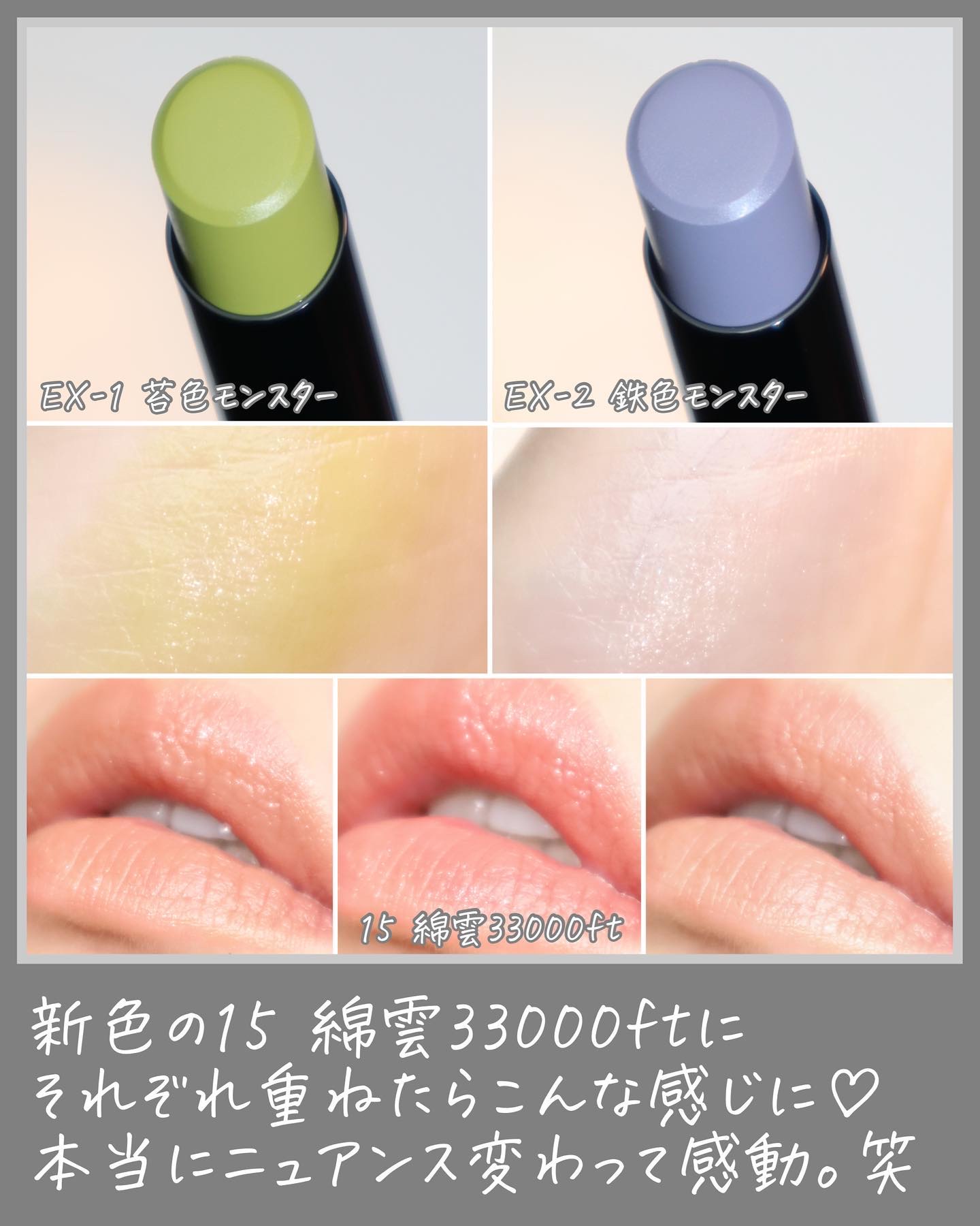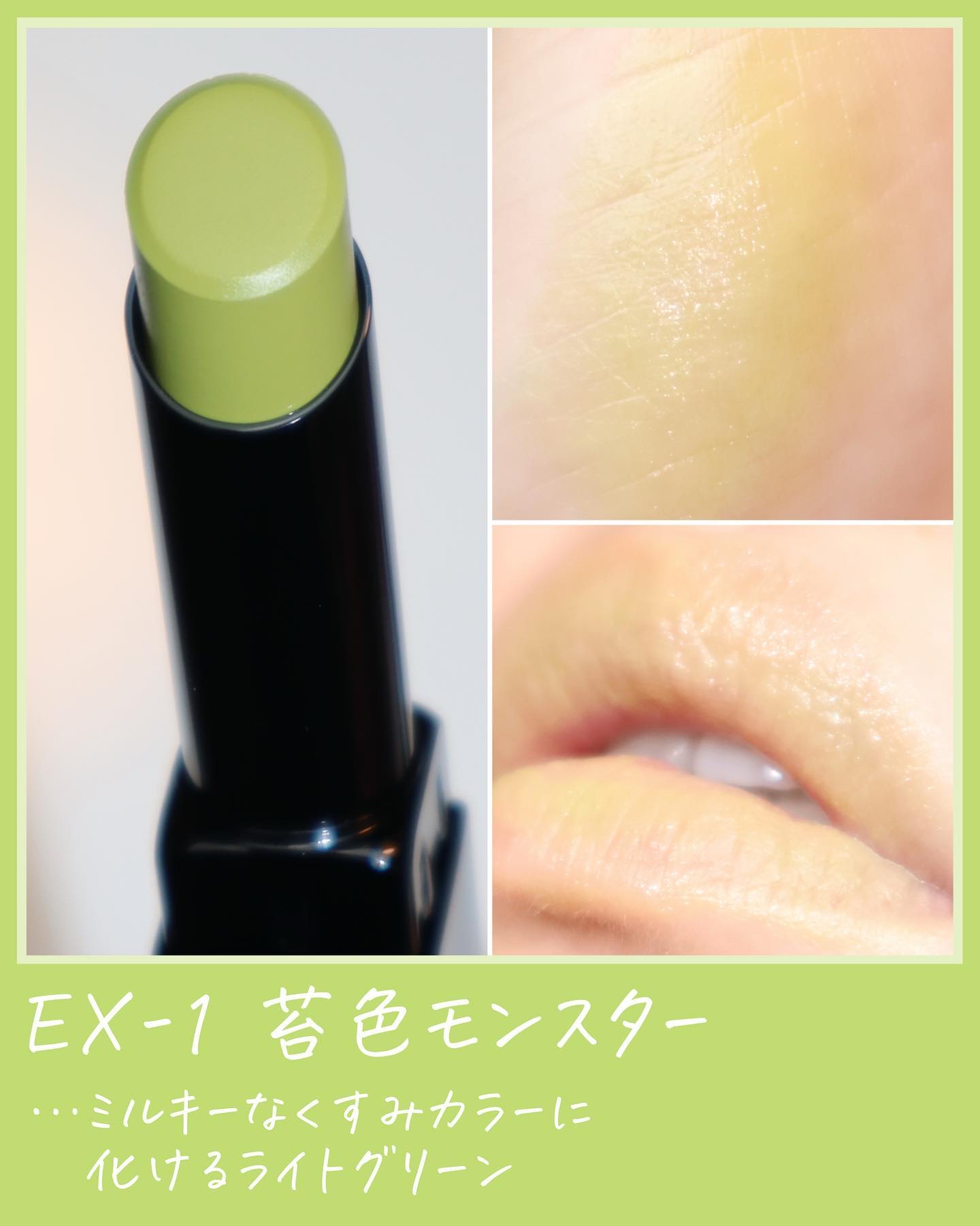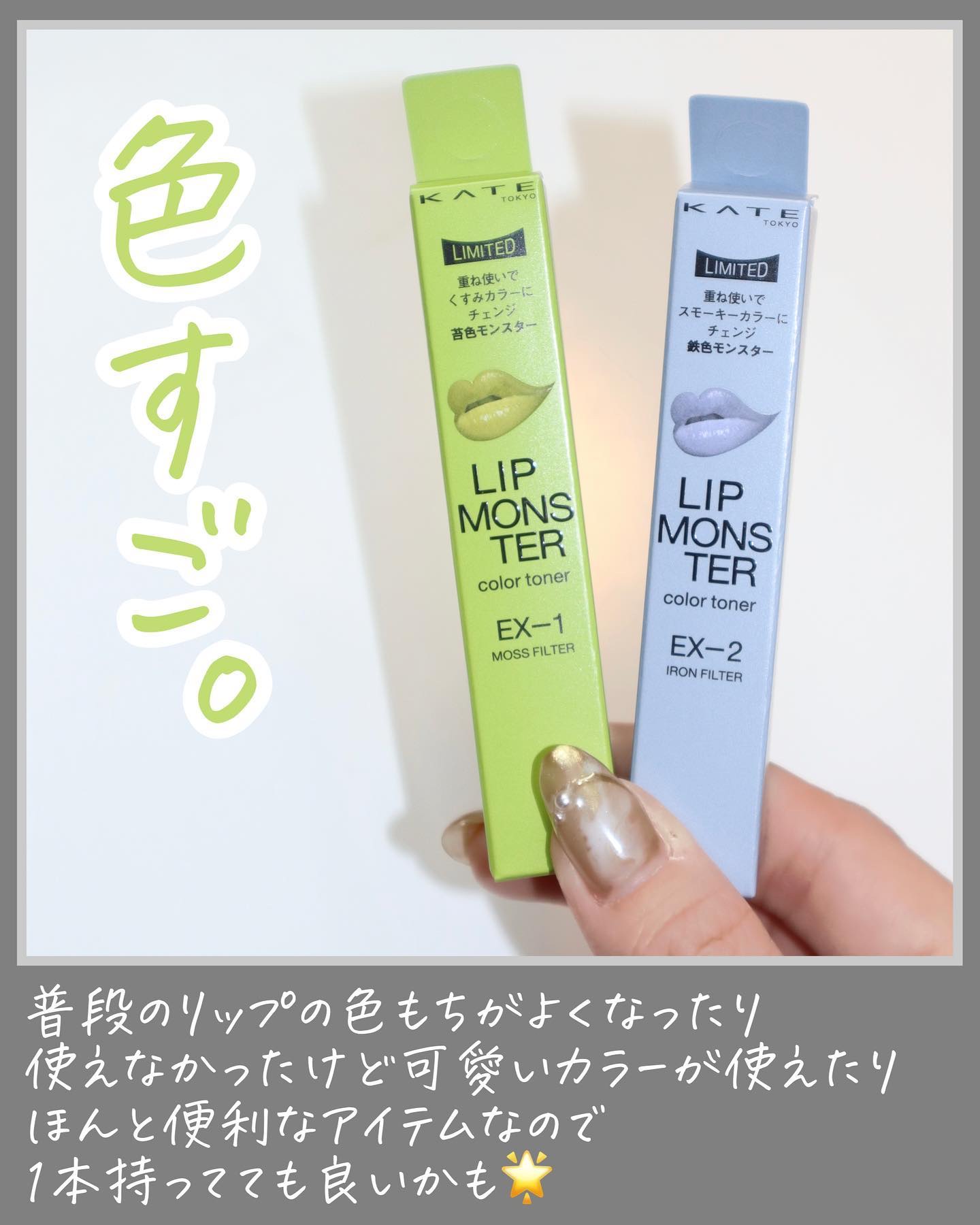 - 【数量限定発売】 口紅の上から重ねて色変化 長時間色持続する闇色モンスター。 当社独自の色持ち技術で、重ねるとモンスター化して落ちにくいリップへ! ■EX-1 苔色モンスター ライトグリーンのリップ上地で、ミルキーなくすみカラーへチェンジ。 ■EX-2 鉄色モンスター ライトグレーのリップ上地で、ダークなスモーキーカラーへチェンジ。 ■EX-3 闇色モンスター クリアブラックのリップ上地で、ダークな深みカラーへチェンジ。