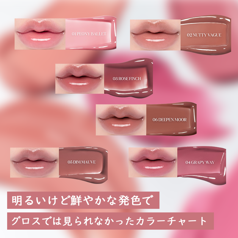 - みずみずしいフルーツがきらめくようなシロップティント ①なめらかで潤いのあるリップを実現 ②果汁のシロップのようなカラー感 ③時間が経つにつれ凸凹を滑らかに密着しボリューム感を演出