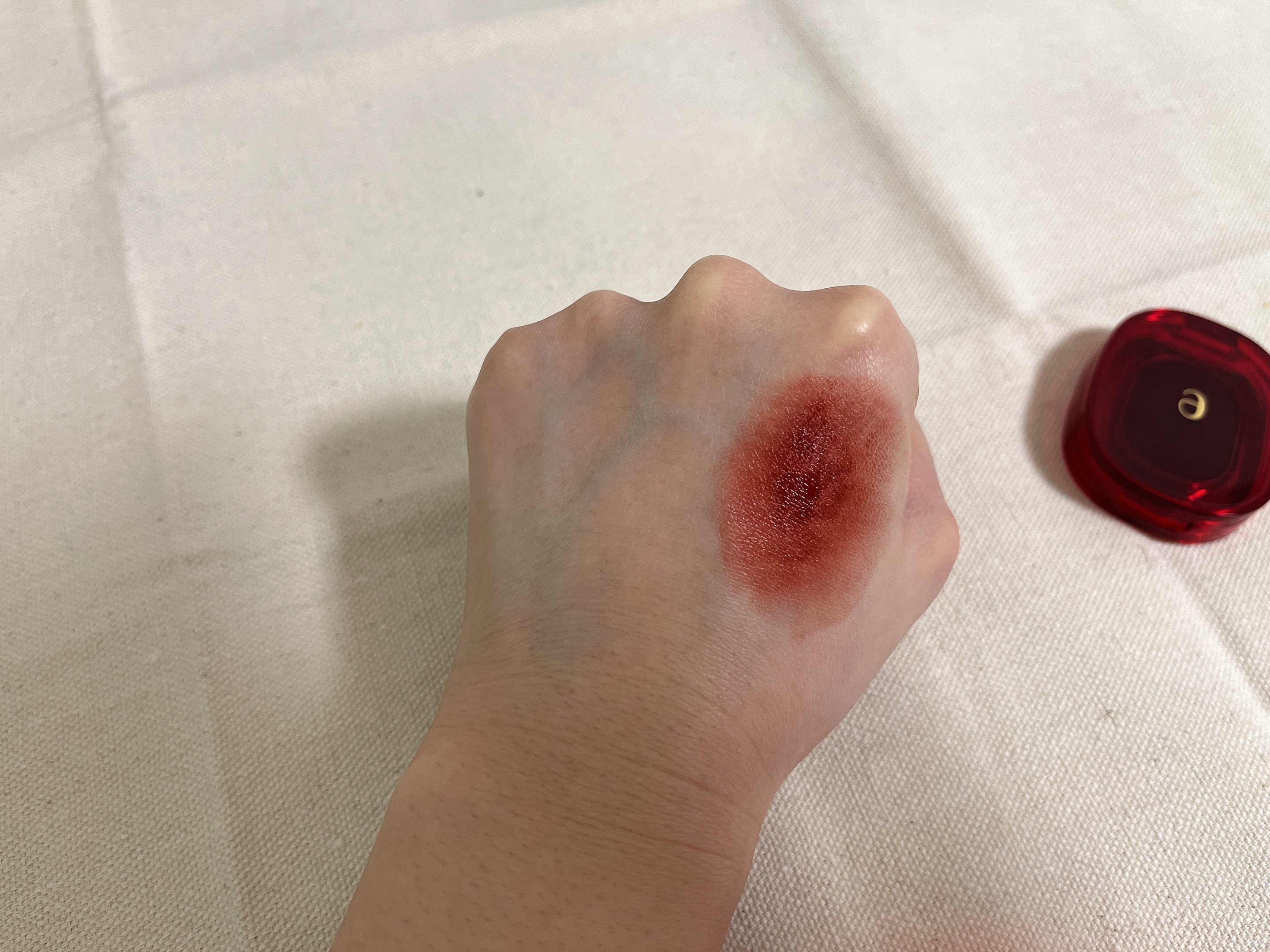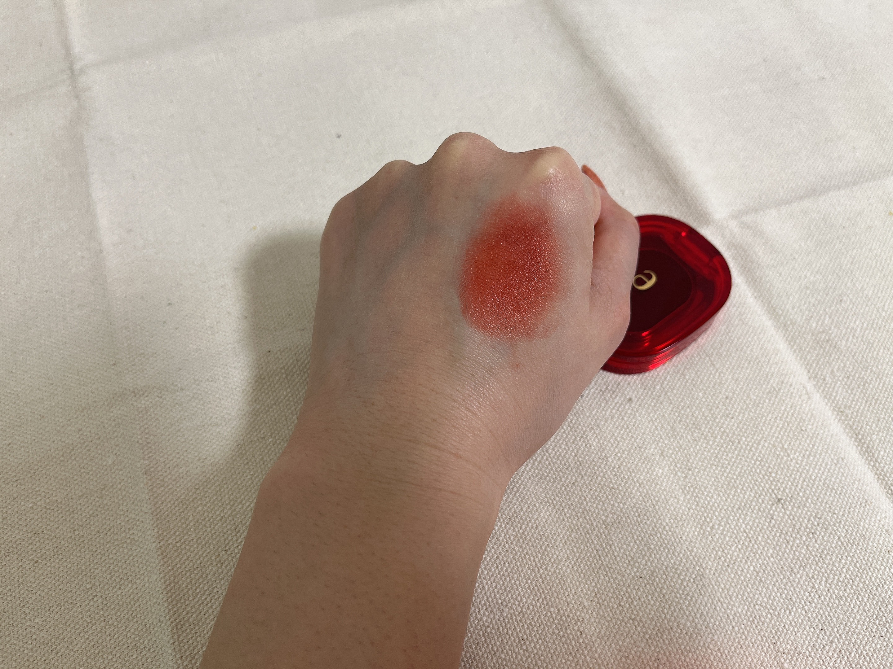 ほんのりパープルやココア色のようなカラーで深み色が苦手な私は似合うか心配だったんだけど目元に乗せるとピンクっぽさも感じて不思議となじみやすくて驚いた! ほんのり白みがあるけど浮かない、絶妙な血色感のヌードオレンジベージュやや固め?なテクスチャで指でさわると溶けてツヤ感ができる。 むちっと密着して唇の形をきれいに見せてくれるし保湿感もあって好みでしたにおいもないのが◎