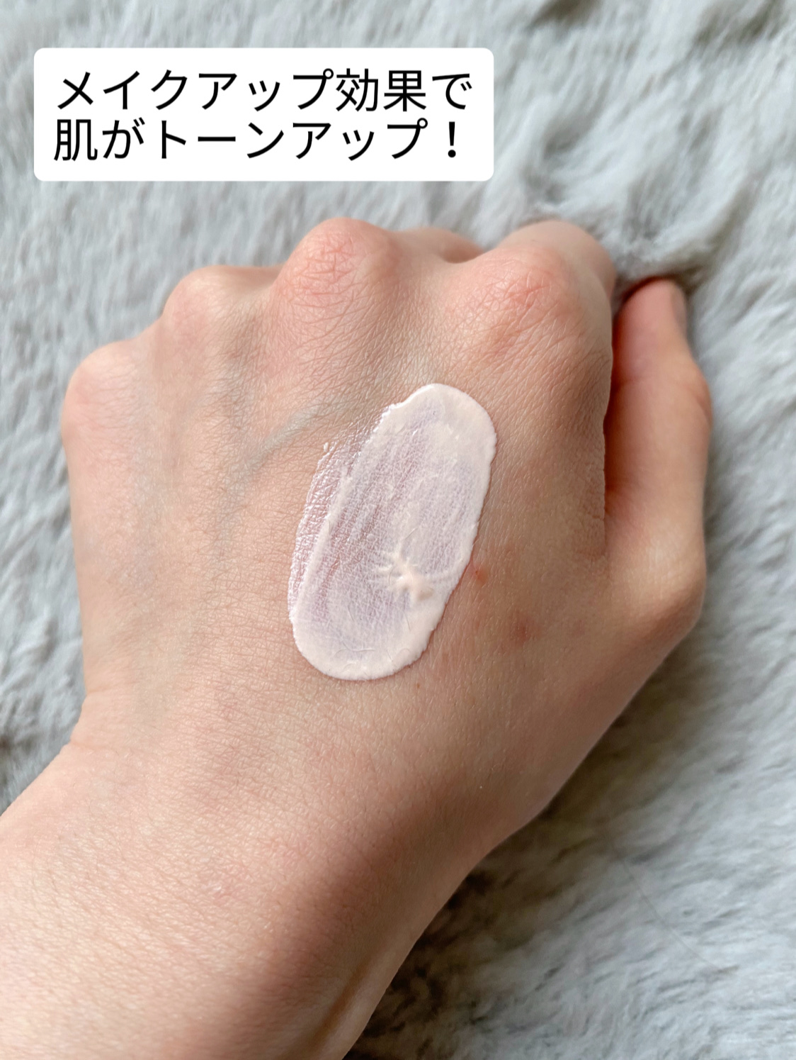 液体そのものがラベンダーの色味をしています。 色味補正機能によりワントーン明るく、白肌に見せてくれます。 伸びが良く塗り広がりが良いです。 確かにトーンアップしますが、私は元々肌が白いのであまり大きな差を感じられない気がしました。 液体そのものは一般的なUVのように白色。 パールが入っており、自然な光沢感を出してくれます。 光を反射したかのような仕上がり。太陽の下に出るとキラキラ輝く肌✨ こちらも塗り広がりはとても良いです。 白肌さんにオススメ! 肌をワンランク上に魅せてくれる気がします💗
