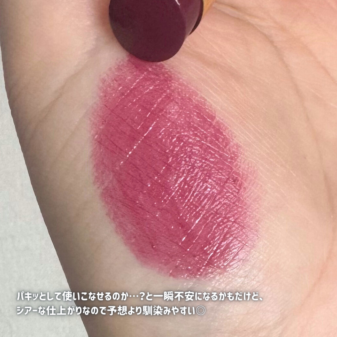 色持ちは無いですが、ちゅるんとした質感に仕上がるリップバーム。 透明感ある葡萄カラー。実際につけると葡萄感はそこまでなくて使いやすい色み◎ やや彩度が落ち着いていて、透け感もあるので大人でも使いやすい🏢 黒を一滴たらしたようなほどよくエッジの効いたカラー。SOOTY HAZEは強すぎなくて盛り耐性なしでも使いやすいです。 砂糖菓子のような甘くてポップなカラー展開のリップバーム。ノック式で出てくるとろけるようなバームで小回りのきく便利さも。 甘さだけじゃない少し落ち着きもあるカラー。軽めの着け心地で自然に唇をうるっと見せてくれます。