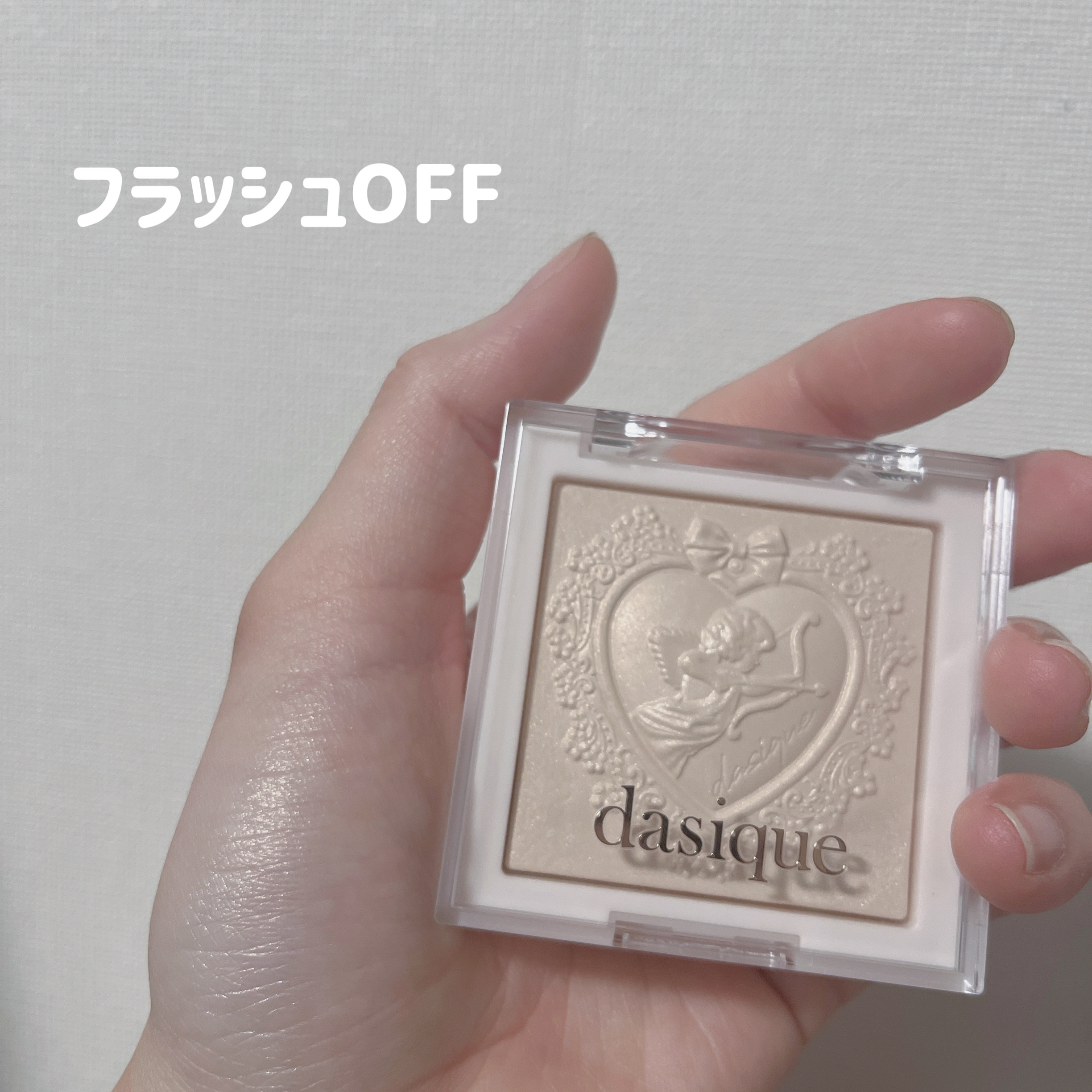 色味は結構白っぽく感じました 白色ベースの中にピンクや黄色の偏光ラメが入っているように見え、ギラギラ系のハイライトというよりかはナチュラル系の自然に発光するハイライトという感じかなと思いました