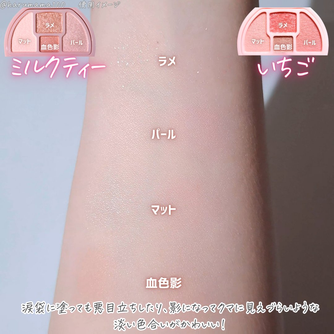 - マット・パール・ラメ入りで3パターンの涙袋が作れる 涙袋用アイシャドウパレット 涙袋用に3色、涙袋の影用に1色がセットされた涙袋用のアイシャドウパレットです。 その日の気分やTPOに合わせて選んでみてくださいね! マットは透け感があり目元のシワが気になりにくく、 パールは繊細で透明感のあるツヤっとした仕上がりに、 ラメはキラキラと輝く透け発色です。 涙袋の影用の「血色影カラー」は、影寄りの色なのに血色感もあって目元が暗くならない パウダーだからこそできた絶妙な色味なんです!