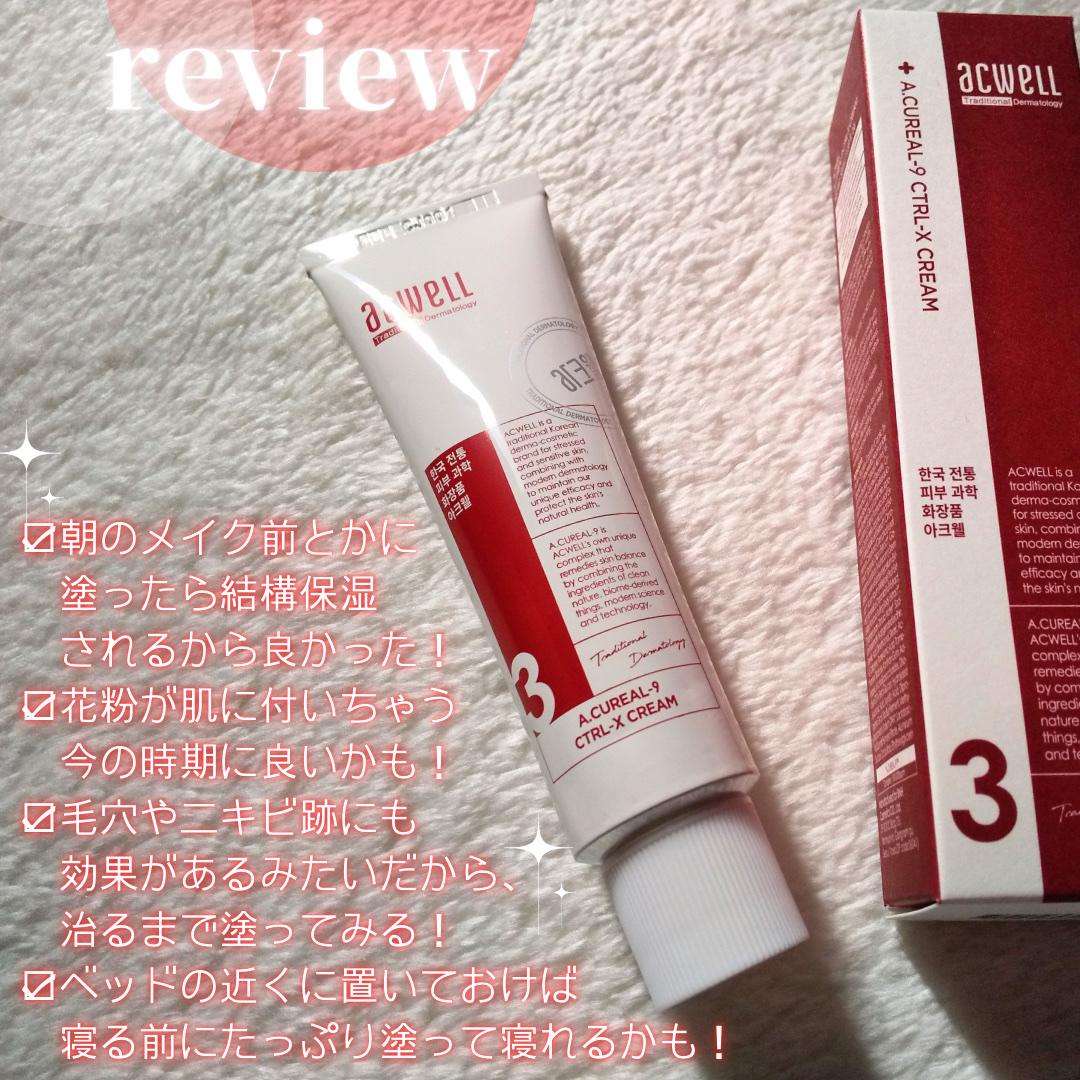 様々なお肌の悩みを解決するクリーム 敏感になった肌の鎮静 毛穴の改善 色素沈着の緩和鎮静 肌トラブルの痕跡を薄くしてくれる! しっとりとしたクリーム 無香料 水分をたっぷり含んだ感じ! 朝のメイク前とかに塗ったら結構保湿されるから良かった! 花粉が肌に付いちゃう今の時期に良いかも! 毛穴やニキビ跡にも効果があるみたいだから、治るまで塗ってみる! ベッドの近くに置いておけば寝る前にたっぷり塗って寝れるかも!