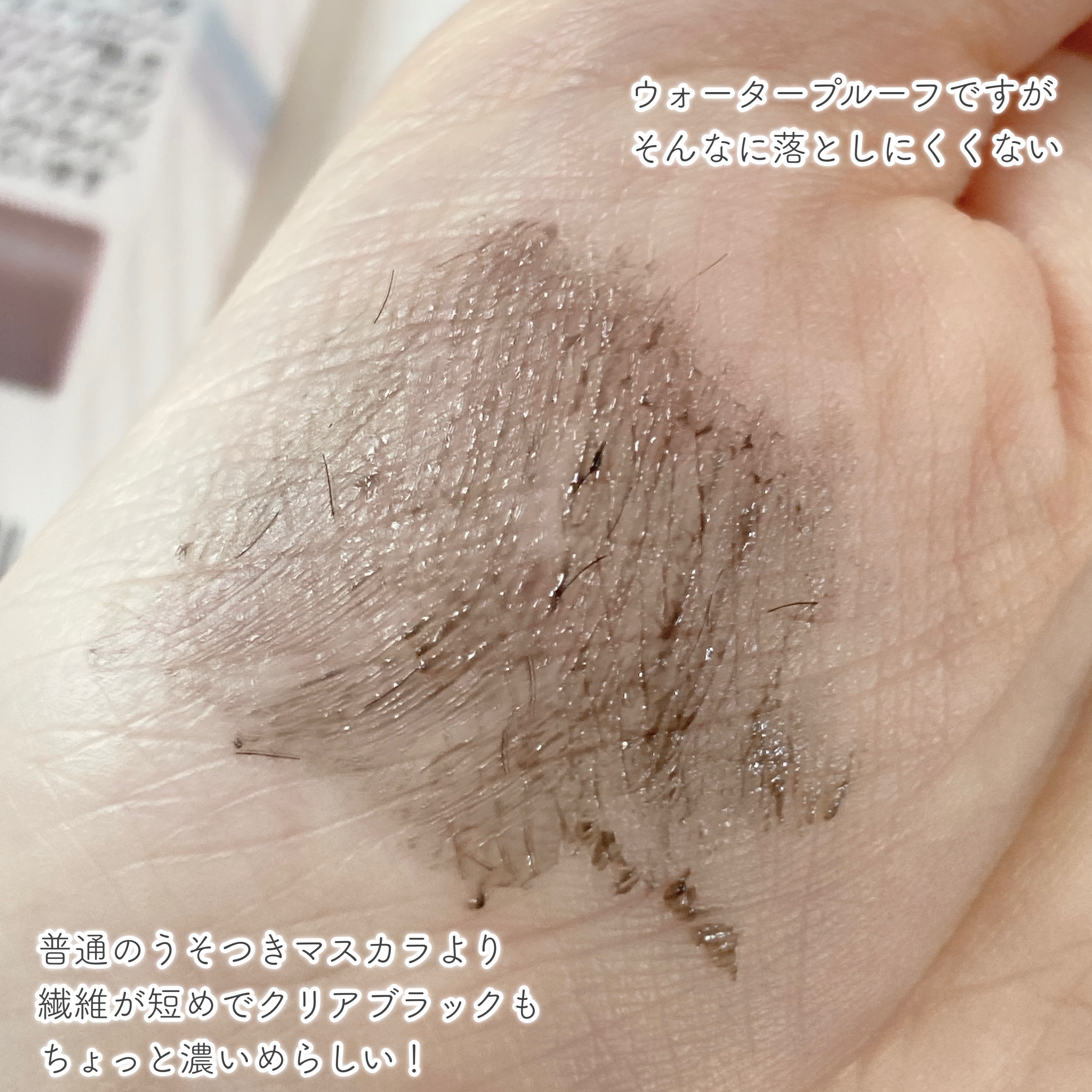 - まるで自まつげが伸びたみたい!うそつきマスカラから下まつげ用マスカラ登場! 超極細ブラシで下まつげもナチュラルだけど目ヂカラUPを叶えます カラー:透け感ブラック <ポイント> ◆下まつげもナチュラルだけど目ヂカラUP! ブラック・ブラウン・クリアのファイバー3種を配合で印象的なロングまつげに仕上げに。 さりげなく色づくクリアブラック液で、抜け感のある仕上がりに。 <マスカラの特長> 下まつげに使いやすいように繊維を調整。 既存品に比べ繊維量を減らすことで下まつげに塗布しても繊維落ちしづらく、クリア感を落とすことでよりまつげが際立ちます。 ◆細かいまつげもしっかりキャッチする超極細ブラシ 1.5㎜の円錐型ブラシは下まつげ、目頭などキワまで塗り残しなく塗ることができます。 目の下にマスカラが付着しにくくパンダ目になりにくいのも特徴。 下まつげだけでなく上まつげにも使用でき、一重さん、奥二重さんにも使っていただきやすい塗りやすさです。