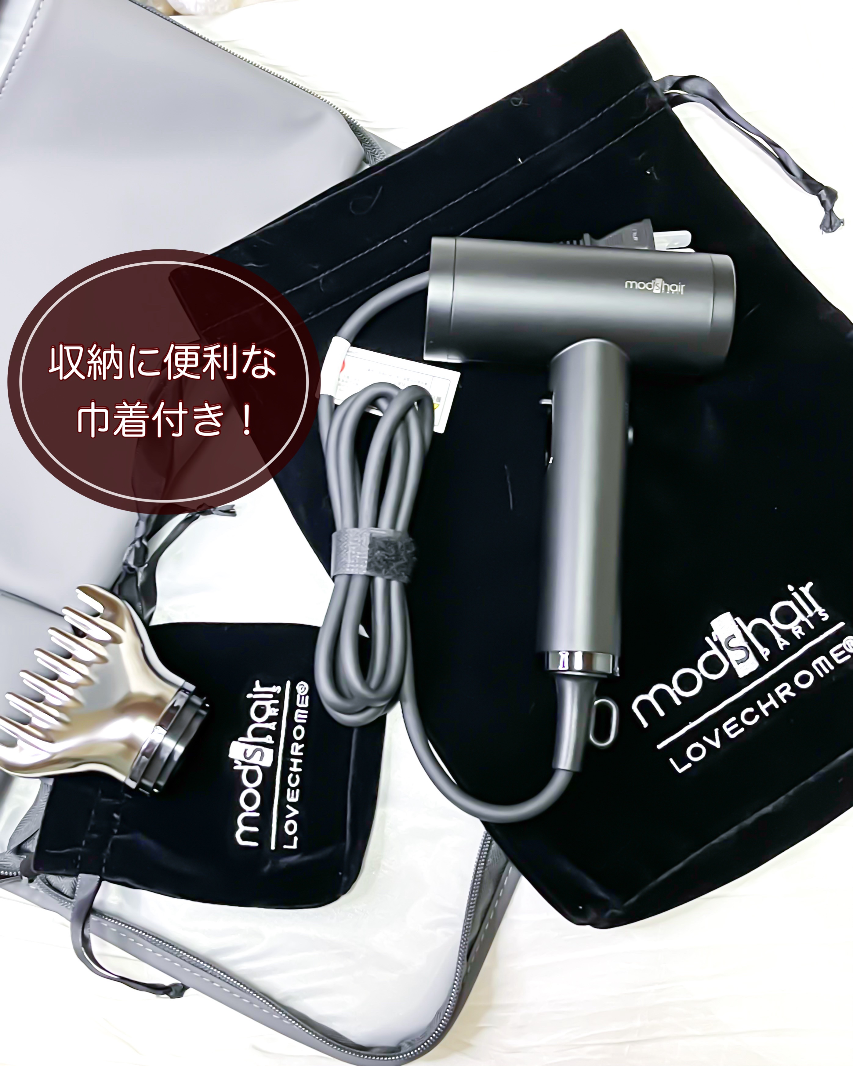 - MOD’S HAIR ×LOVE CHROMEヘアドライヤー「PRIVILÉGE LA BEAUTÉ(プリヴィレージュ ラ・ボーテ)MHD-1210-K」。 ■PRIVILÉGE LA BEAUTÉ モッズ・ヘアのサロンクオリティに基づいたスタイリングツールやスタイリングへの豊富な知識と経験が、 LOVE CHROME のダメージレスなヘアケアをサポートする技術と掛け合わせ、美髪を守るヘアドライ、 ヘアセットができワンランク上の仕上がりを提供致します。ラ・ボーテで、サラ サラ・ツヤ・まとまりのあるサロン帰りのような髪をご自宅でも体感ください。 【製品特徴】 ●高風速を実現する新モーター採用 (風速:33.6m/s) ●LOVE CHROMEとコラボ「クシノズル」付属 ツヤのあるなめらかなワンランク上の仕上がりに ・髪のツヤ約10%UP*1*2 ・髪のなめらかさ約58%UP*1*3 ●温冷自動切替でさらっとまとまる ●HOT/SALON/SCALPモード搭載 ●無段階 風速調節スイッチ ●マイナスイオン搭載 ●お手入れカンタンフィルター ●オリジナルポーチ *1 第三者機関調べ *2 手ぐしとラブクロムクシノズルでブローした場合の毛髪光沢度を計測 *3 使用前比較