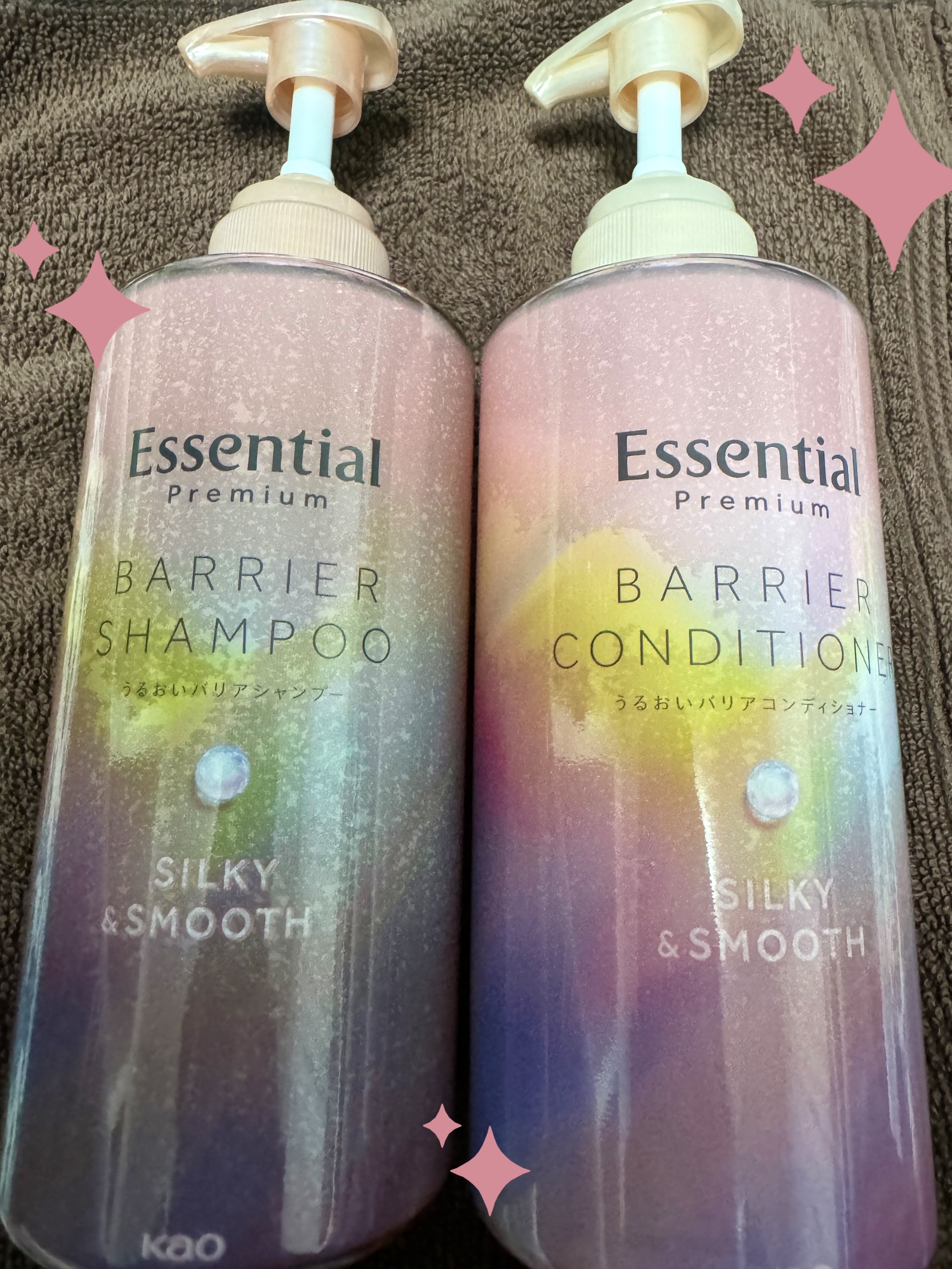 ♡エッセンシャル♡エッセンシャルプレミアムバリアシャンプー・コンディショナーシルキー&スムースシャンプーはふわふわ泡立ちが良く、全体的にピーチの香りに包まれとても幸せな気分になりました🍑コンディショナーをすると指通りがつるんと全体的なまとまり...