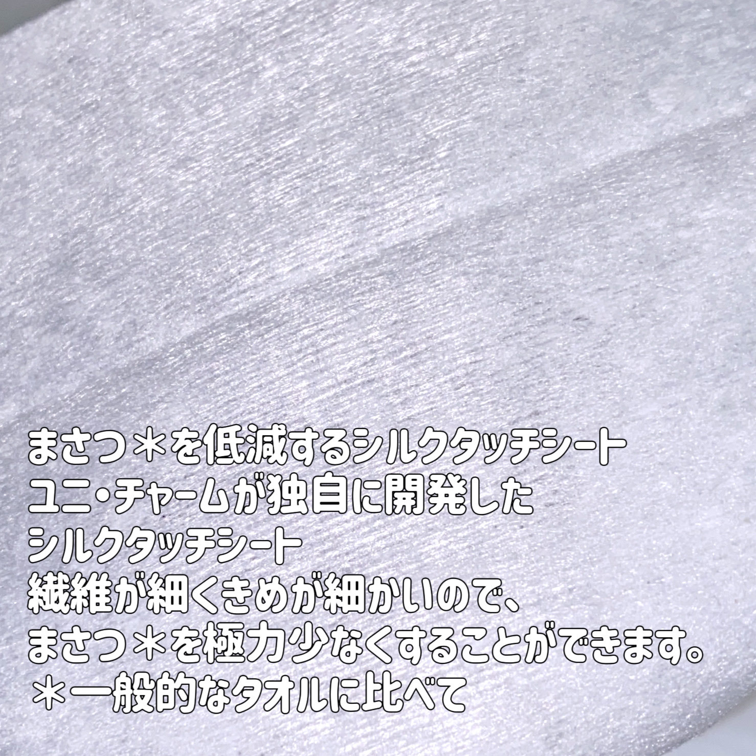 肌への優しさにこだわったシルクタッチシートがお肌の水分をサッと吸収。 1枚で顔全体を覆えるぐらい充分な大きさ!(約20cm×20cm) ティッシュのように1枚ずつ取り出せるのも楽々♪
