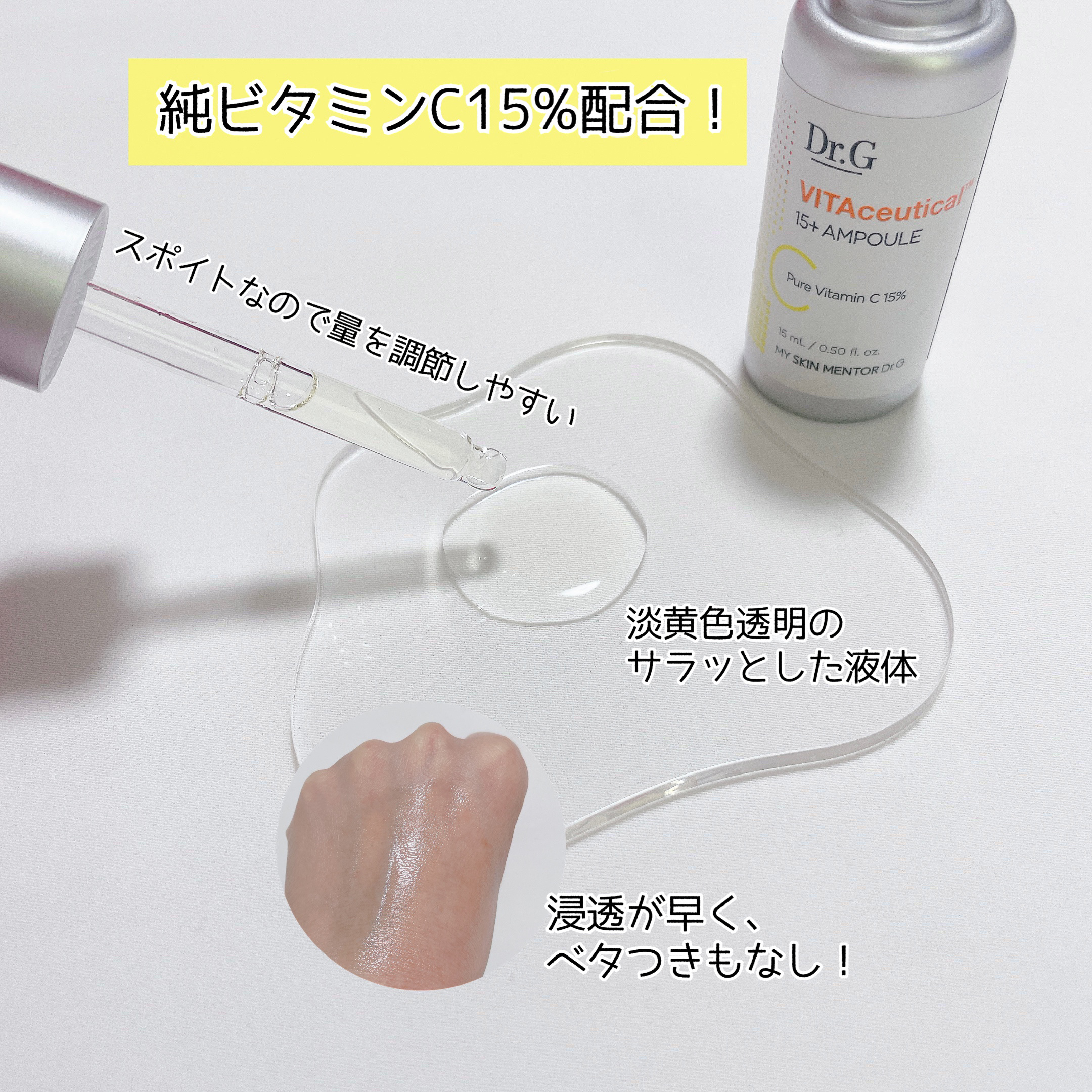 15mlで使い切りやすいサイズ感 蓋を開ける時結構固くて しっかり密封されている感じがしました! サラッとしたテクスチャーなので、 アンプルを出す時にパッケージを 倒さないように慎重に出したほうが良さそう🫡 塗ったあとはベタつかずに使えます ビタミンC美容液特有の香りが しますが自分は全く気にならないです 使い心地よい◎