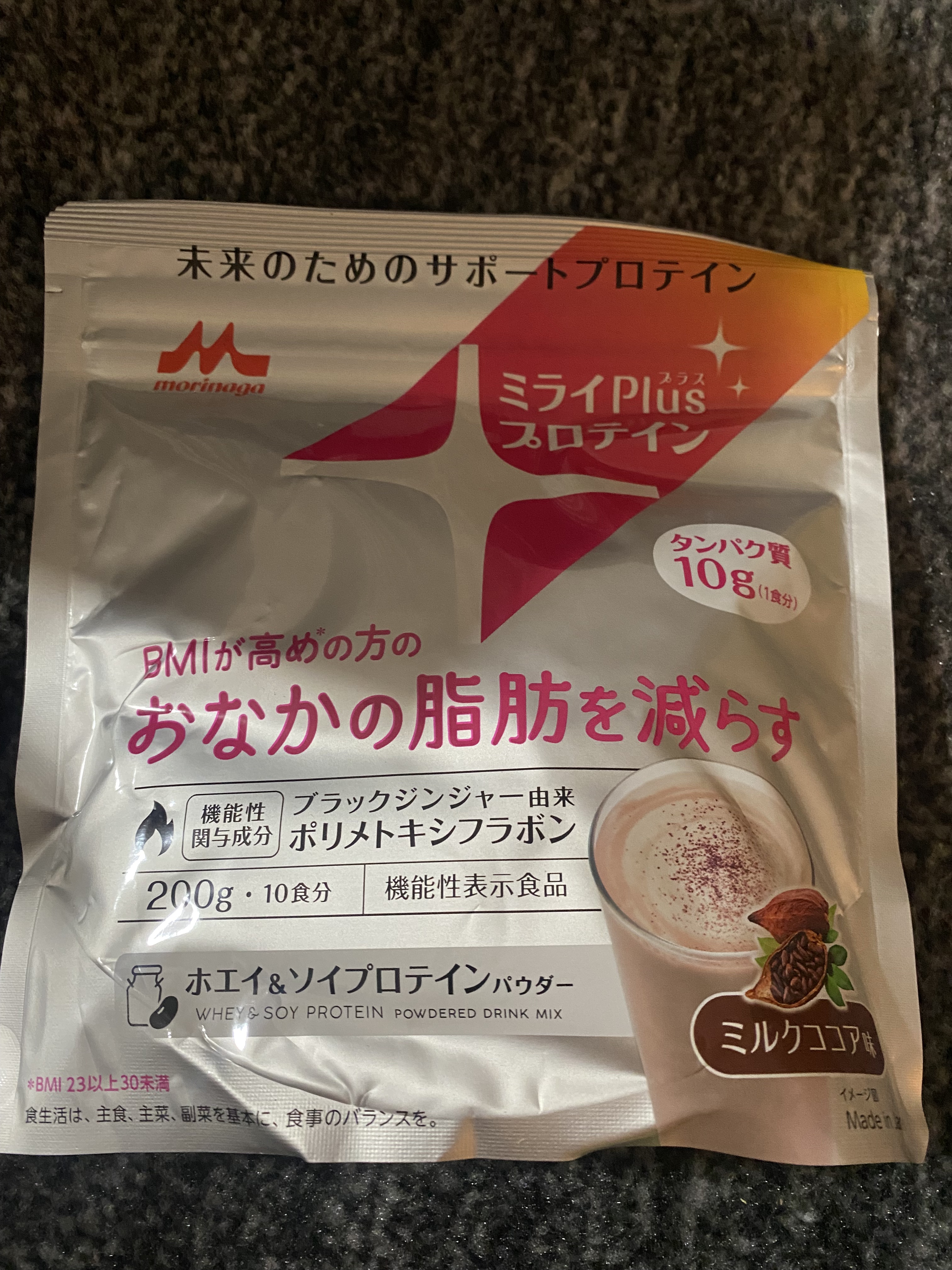 森永 ミライPlusおなかの脂肪対策プロテインパウダー試供品をいただきました。ミルクココア味BMIが高めの方のおなかの脂肪にアプローチするブラックジンジャー由来ポリメトキシフラボン配合の機能性表示食品女性の健康と美に大切なタンパク質を1食あた...