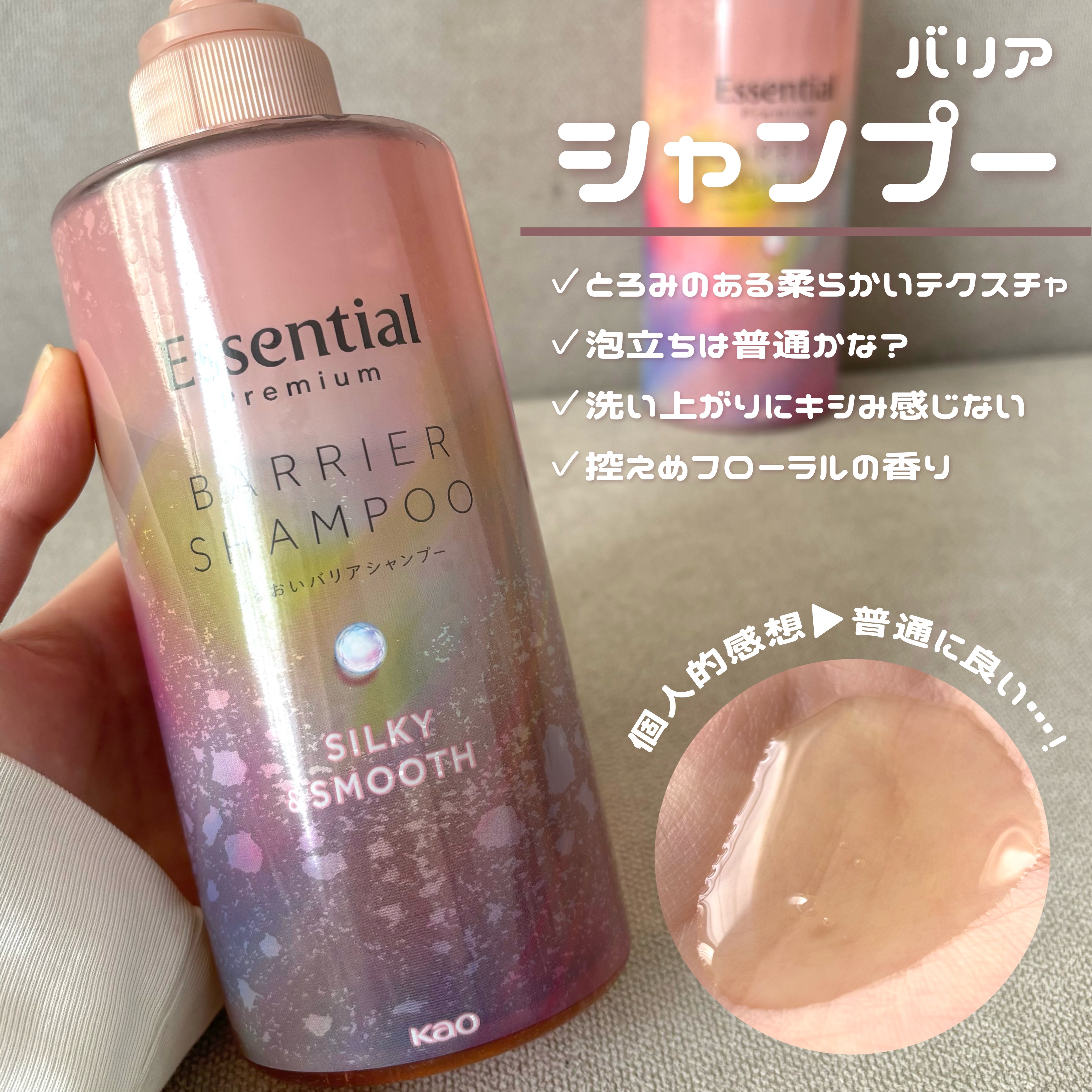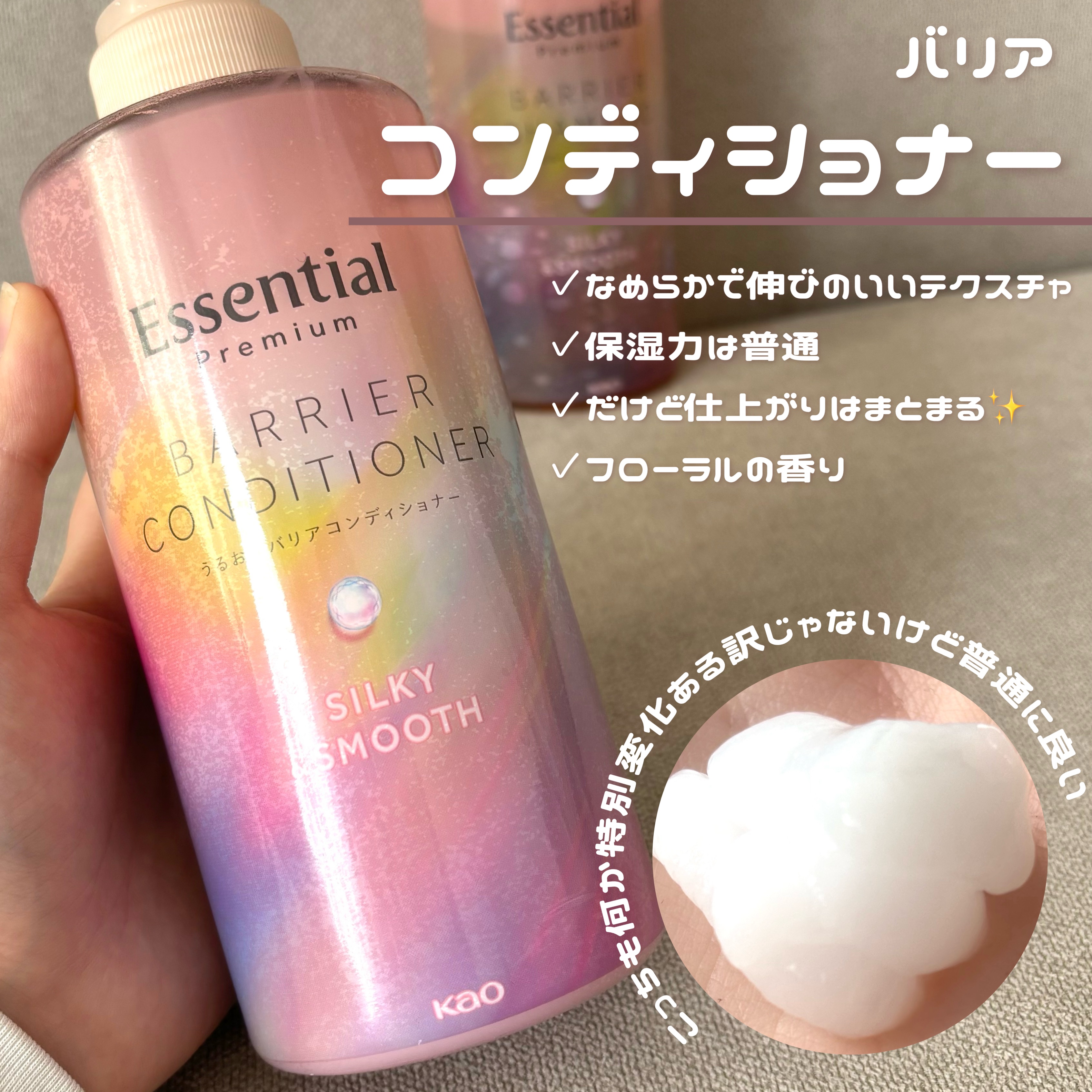 ♡エッセンシャル♡エッセンシャルプレミアムバリアシャンプー・コンディショナーシルキー&スムースシャンプーはふわふわ泡立ちが良く、全体的にピーチの香りに包まれとても幸せな気分になりました🍑コンディショナーをすると指通りがつるんと全体的なまとまり...