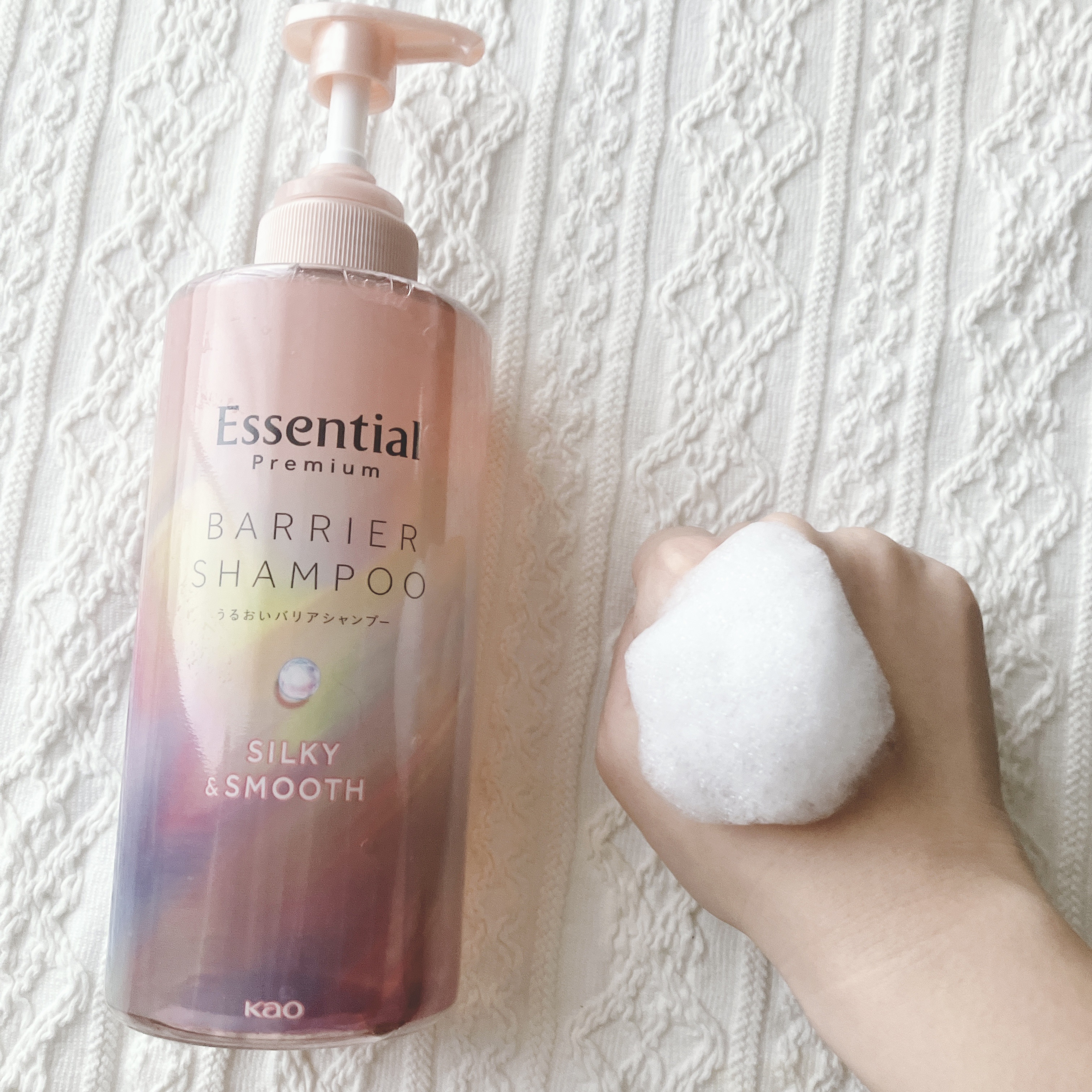 ♡エッセンシャル♡エッセンシャルプレミアムバリアシャンプー・コンディショナーシルキー&スムースシャンプーはふわふわ泡立ちが良く、全体的にピーチの香りに包まれとても幸せな気分になりました🍑コンディショナーをすると指通りがつるんと全体的なまとまり...