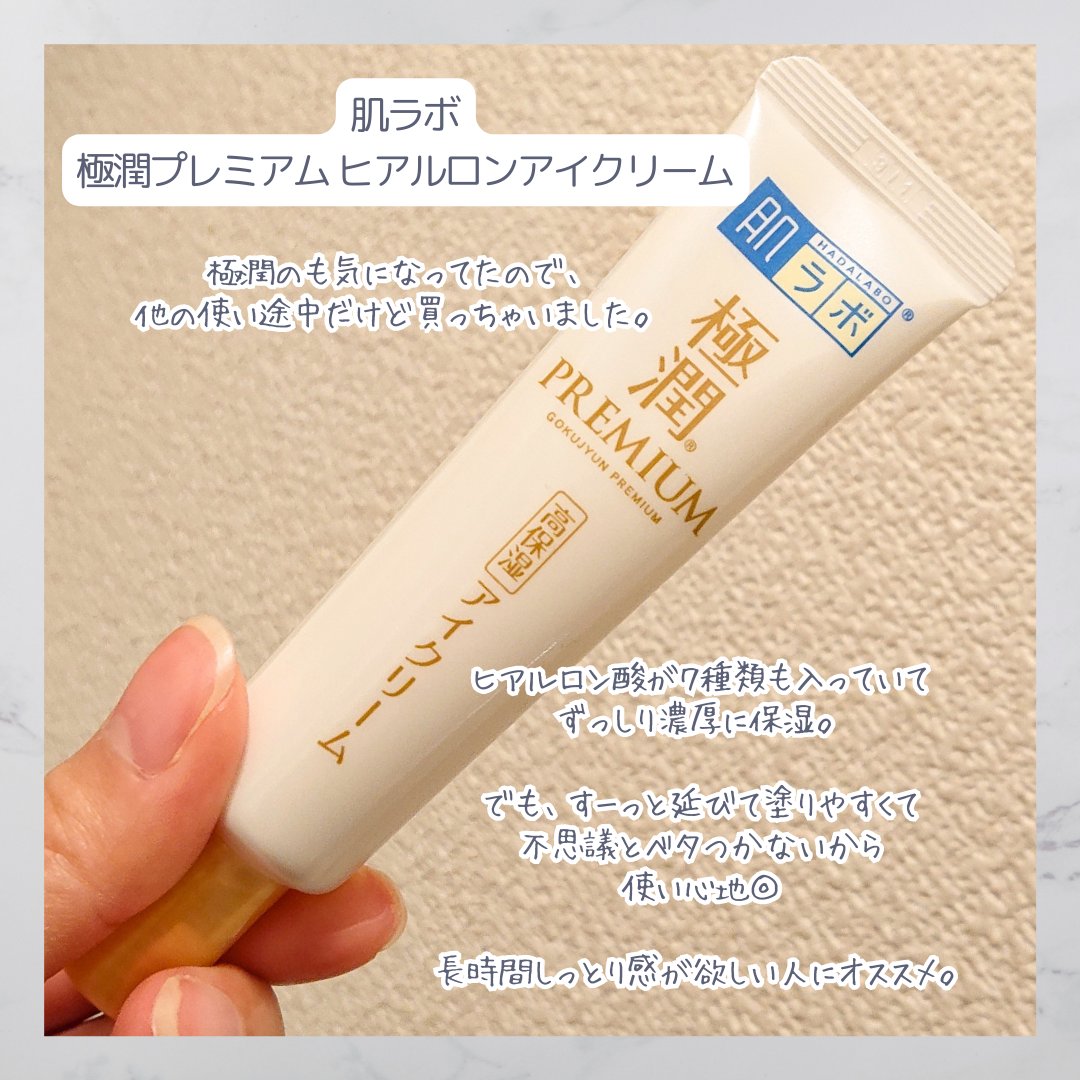 ︎✿肌ラボ極潤プレミアムヒアルロンアイクリーム¥1,131大人気肌ラボのアイクリームを発見して思わず購入!値段も安いし即買い♪アイクリームって意味あるのかなって思うけど続けることが大事だよね!♥ヒアルロン酸配合♥もったりしたクリームなのにベタ...