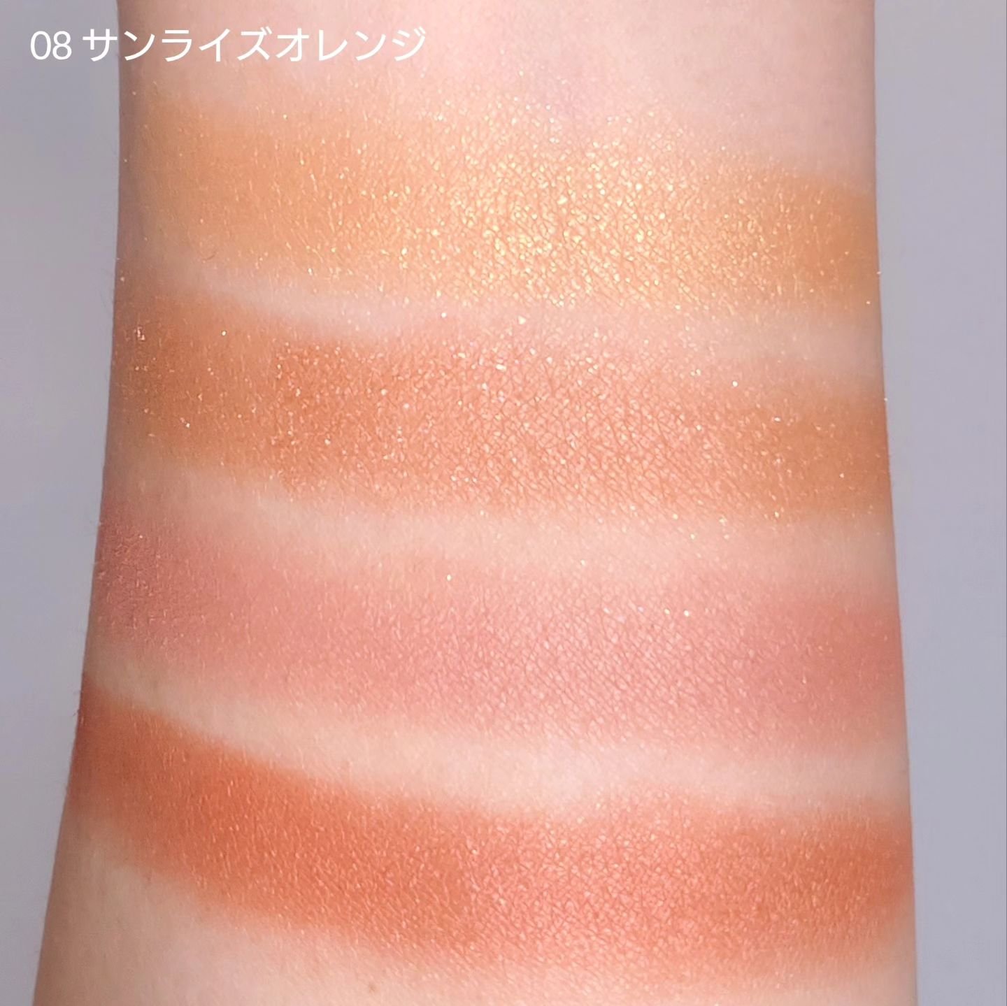 粉質が柔らかできめ細かくマルチなブラウンが使いやすい ほどよいラメ感がデイリーメイクにぴったり 07 サイレントベージュ 王道ブラウンはこちら 赤みや黄みがほんのり入っていて失敗しにくい組み合わせ 08 サンライズオレンジ 明るめだけどブラシでフワッと乗せると肌になじむカラー 左上は見た目ほど黄色が発色しないのでゴールドラメとして使えます