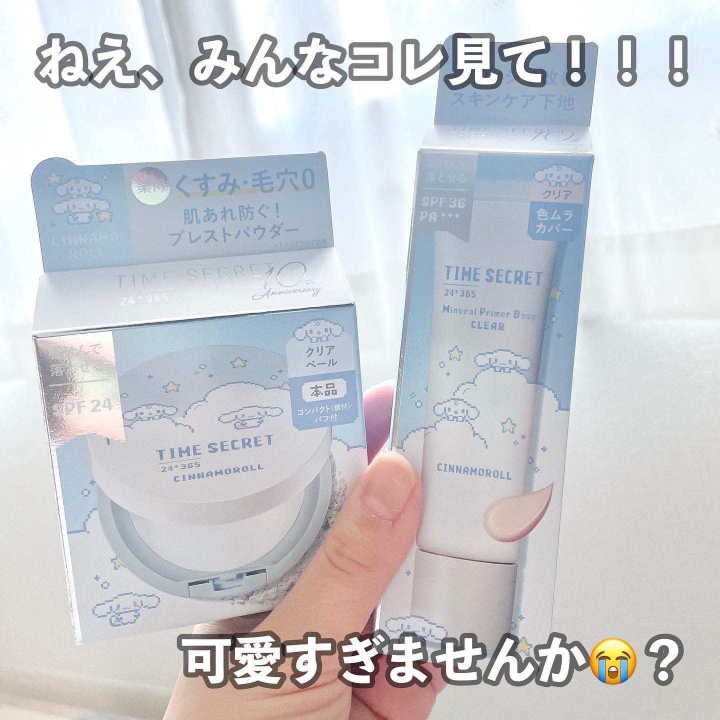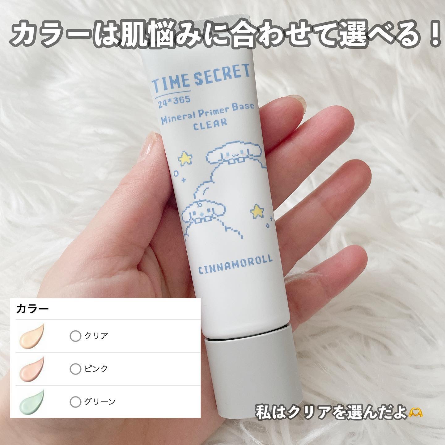 タイムシークレット誕生10周年記念のクロミちゃんとのパッケージコラボ📦🌟 3種類の肌悩みに合わせて選べる化粧下地🫶🏻🍒 私は、クリアが1番好き🥹 肌につけた時に1番、自分にしっくりきたのと色浮きしないし私の肌色に馴染んでた🥨 SPF36 PA+++の紫外線防止力があるよ!紫外線はシミになってしまう主な原因て言われてるしやっぱり肌パーソナル気にしながらも下地からしっかり紫外線予防しよう🥹