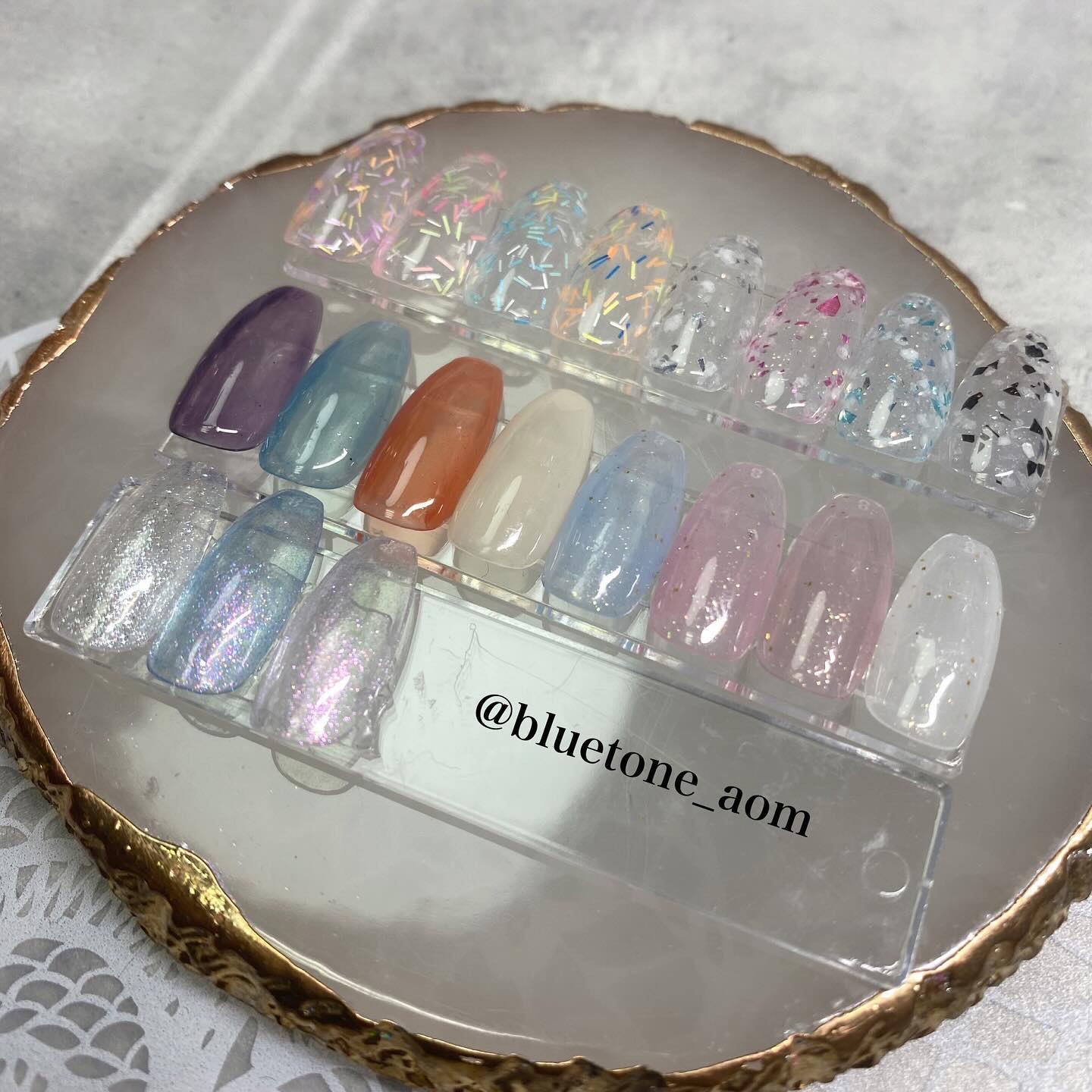 ラメがしっかりしてるし クリアカラーが入ってるから オーロラパウダー無しでも 充分キラキラしました! 反射強めのフィルムなので 実物はもっと うるうるとキラキラが強いです! ビー玉みたい🥺 ネイルシール長持ちさせたいけど ちょっと飽きてきたな〜って時とかに 全然違った印象になるのでオススメです! Seriaのベースジェル 本当にうるうるネイルしやすいので オススメしたい🙆♀️