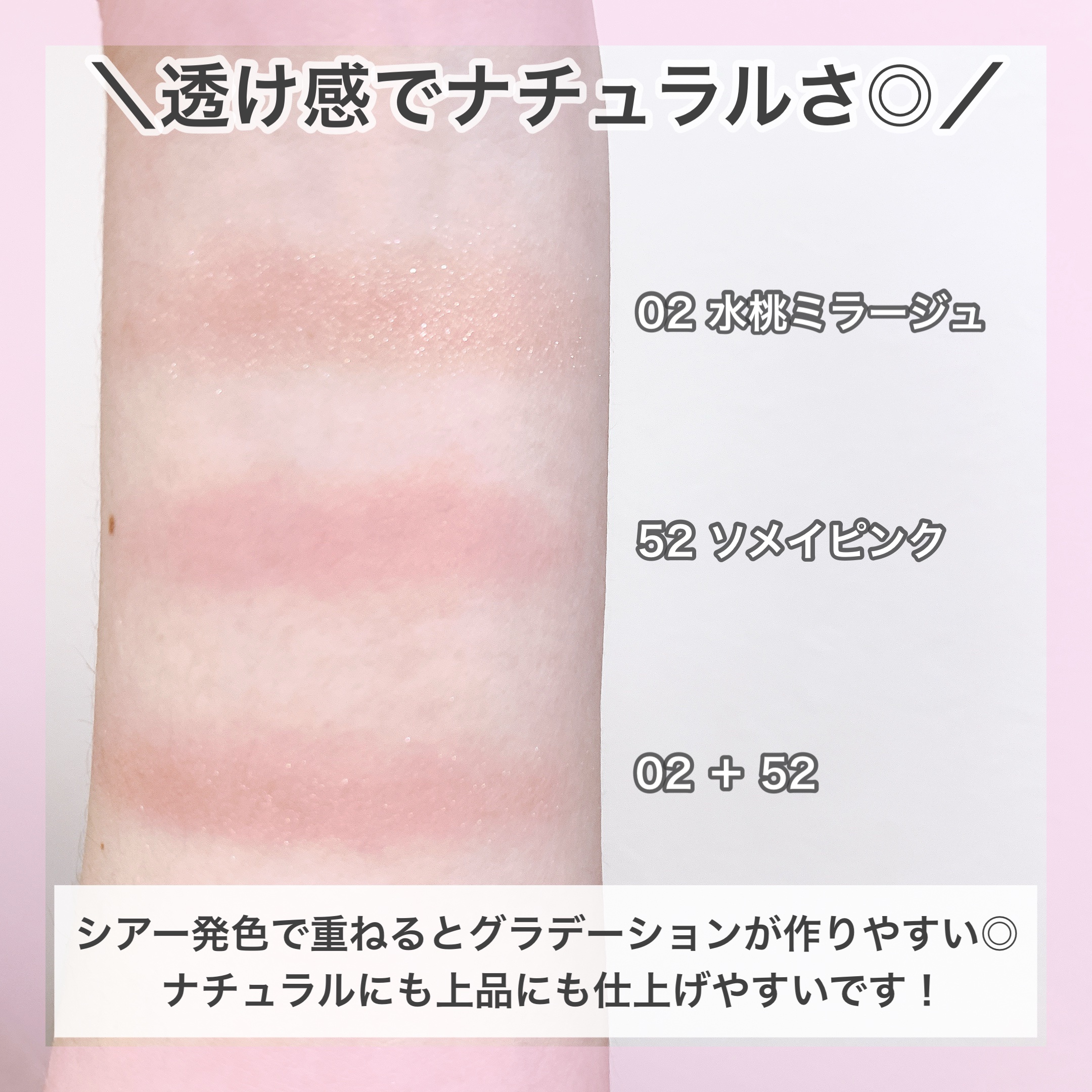 クリームアイシャドウのようなテクスチャー。伸びやすく、瞼に密着する感じ。塗ったあとはベタつかずサラッとしました。 水桃ミラージュは微細パールのきらめきのGLOWタイプ。光の当たり方や見る角度の違いで、シェルピンクに見えたり、ピーチっぽく見えました。 春らしいカラーで可愛いです🫶 マットタイプのソメイピンクも気になる👀