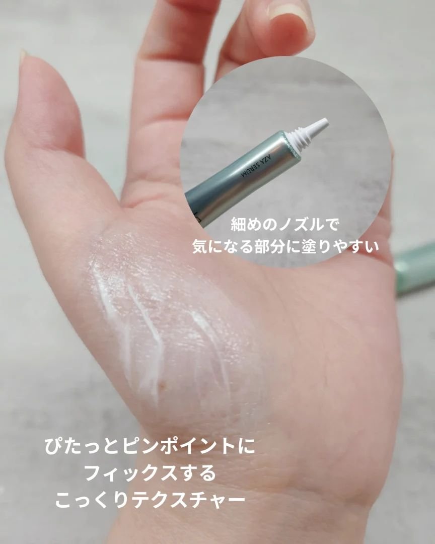 - <本体> 水、アゼライン酸、BG、トリエチルヘキサノイン、ミネラルオイル、トリ(カプリル酸/カプリン酸) グリセリル、ジグリセリン、ペンチレングリコール、ステアリン酸グリセリル、ホホバ種子油、PEG-60水添ヒマシ油、EDTA-2Na、ナイロン-12、セタノール、(アクリロイルジメチルタウリンアンモニウム/VP) コポリマー、ステアロキシヒドロキシプロピルメチルセルロース