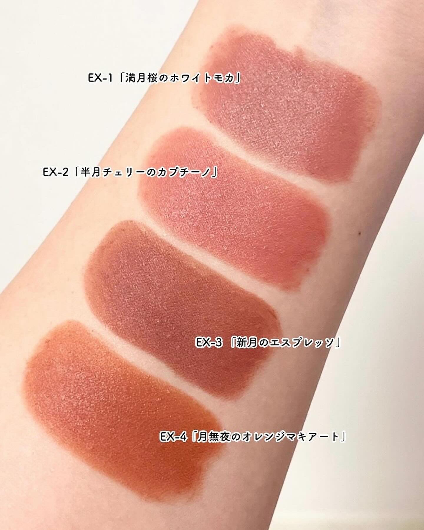 - <EX-1 ホワイトピンク系【満月桜のホワイトモカ】> リンゴ酸ジイソステアリル、ジメチコン、合成ワックス、イソノナン酸イソトリデシル、(ジメチコン/ビニルジメチコン)クロスポリマー、合成フルオロフロゴパイト、ダイマージリノール酸(フィトステリル/イソステアリル/セチル/ステアリル/ベヘニル)、キャンデリラロウ、シリカ、パラフィン、イソステアリン酸ソルビタン、マイクロクリスタリンワックス、(+/-)マイカ、酸化チタン、酸化鉄、水酸化Al、黄4、赤202 <EX-2 ピンクベージュ系【半月チェリーのカプチーノ】> リンゴ酸ジイソステアリル、ジメチコン、合成ワックス、イソノナン酸イソトリデシル、(ジメチコン/ビニルジメチコン)クロスポリマー、合成フルオロフロゴパイト、ダイマージリノール酸(フィトステリル/イソステアリル/セチル/ステアリル/ベヘニル)、キャンデリラロウ、シリカ、パラフィン、イソステアリン酸ソルビタン、マイクロクリスタリンワックス、(+/-)マイカ、酸化チタン、酸化鉄、水酸化Al、黄4、赤202 <EX-3 ピンクブラウン系【新月のエスプレッソ】> リンゴ酸ジイソステアリル、ジメチコン、合成ワックス、イソノナン酸イソトリデシル、(ジメチコン/ビニルジメチコン)クロスポリマー、合成フルオロフロゴパイト、ダイマージリノール酸(フィトステリル/イソステアリル/セチル/ステアリル/ベヘニル)、キャンデリラロウ、シリカ、パラフィン、イソステアリン酸ソルビタン、マイクロクリスタリンワックス、(+/-)マイカ、酸化チタン、酸化鉄、水酸化Al、黄4、赤202 <EX-4 オレンジベージュ系【月無夜のオレンジマキアート】> リンゴ酸ジイソステアリル、ジメチコン、合成ワックス、イソノナン酸イソトリデシル、(ジメチコン/ビニルジメチコン)クロスポリマー、合成フルオロフロゴパイト、ダイマージリノール酸(フィトステリル/イソステアリル/セチル/ステアリル/ベヘニル)、キャンデリラロウ、シリカ、パラフィン、イソステアリン酸ソルビタン、マイクロクリスタリンワックス、(+/-)マイカ、酸化チタン、酸化鉄、水酸化Al、黄4、赤202