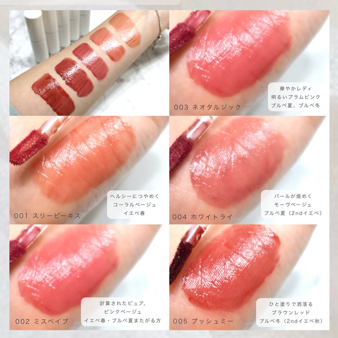 色もちも良くって乾燥しにくいから文句のつけどころがない。 ☑︎201 Miro粘膜ピンクレッド→イエベ春・ブルベ夏 ☑︎203 Markじゅんわり多幸感コーラル→イエベ春 ☑︎204 Haveピュアなベイビーピンク→イエベ春・ブルベ夏(明るめ得意) ☑︎207 Depthレディな透けプラムレッド→ブルベ冬のデイリーブルベ夏の華やか ☑︎208 Poshニュートラルなレッド→ブルベ冬・イエベ春秋(鮮やか得意) ☑︎209 Near落ちついた洒落感オレンジ→イエベ春・イエベ秋(黄み得意) ☑︎213 Jeffブラウンが溶け込んだローズイエベ秋(2ndブルベ夏) ☑︎215 Lennaクリアで可憐な青みピンクブルベ夏冬(明るめ得意) ☑︎216 Winterディープなプラムレッドブルベ冬(青み得意)