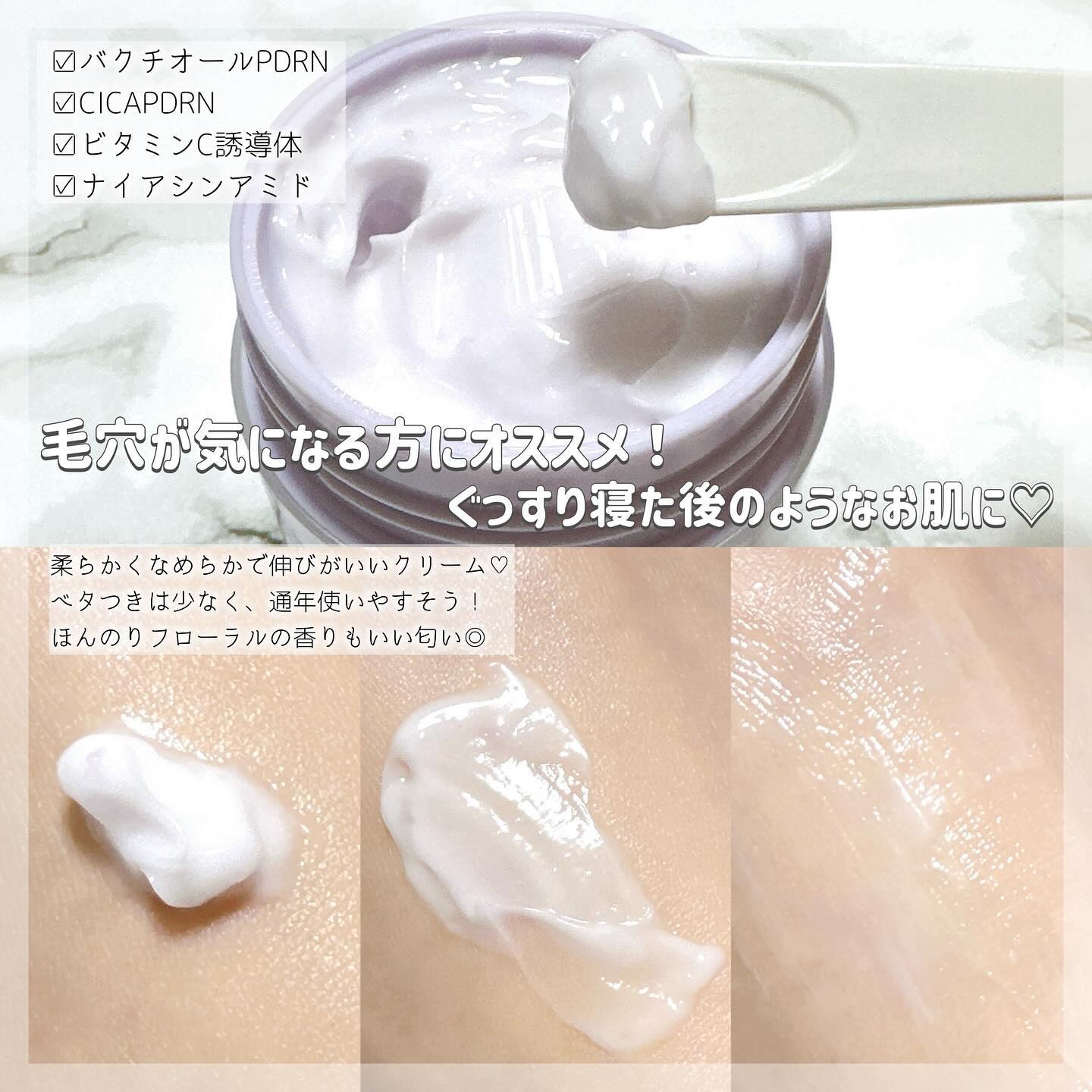 | テクスチャーはふわっとしたクリームで肌に馴染みやすくベタつきはなし 本当に使いやすいクリームです✨ | 詳細を見る | ||