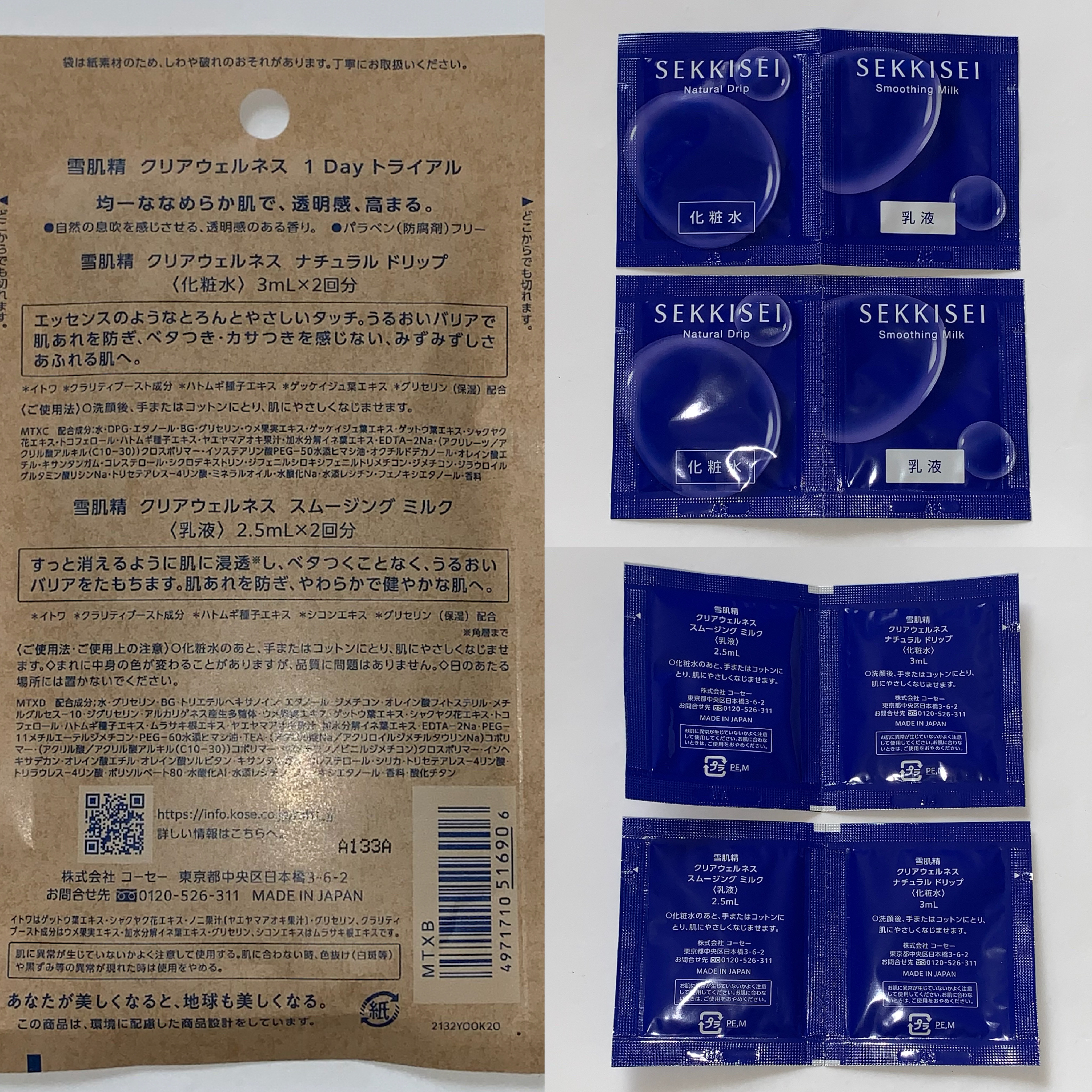 - 均一な、なめらか肌で、透明感、高まる。 化粧水(ナチュラルドリップ)と乳液(スムージングミルク)がおためしできる1DAYトライアル セット内容 雪肌精クリアウェルネスナチュラルドリップ・・3ml×2回分 雪肌精クリアウェルネススムージングミルク・・2.5mi×2回分