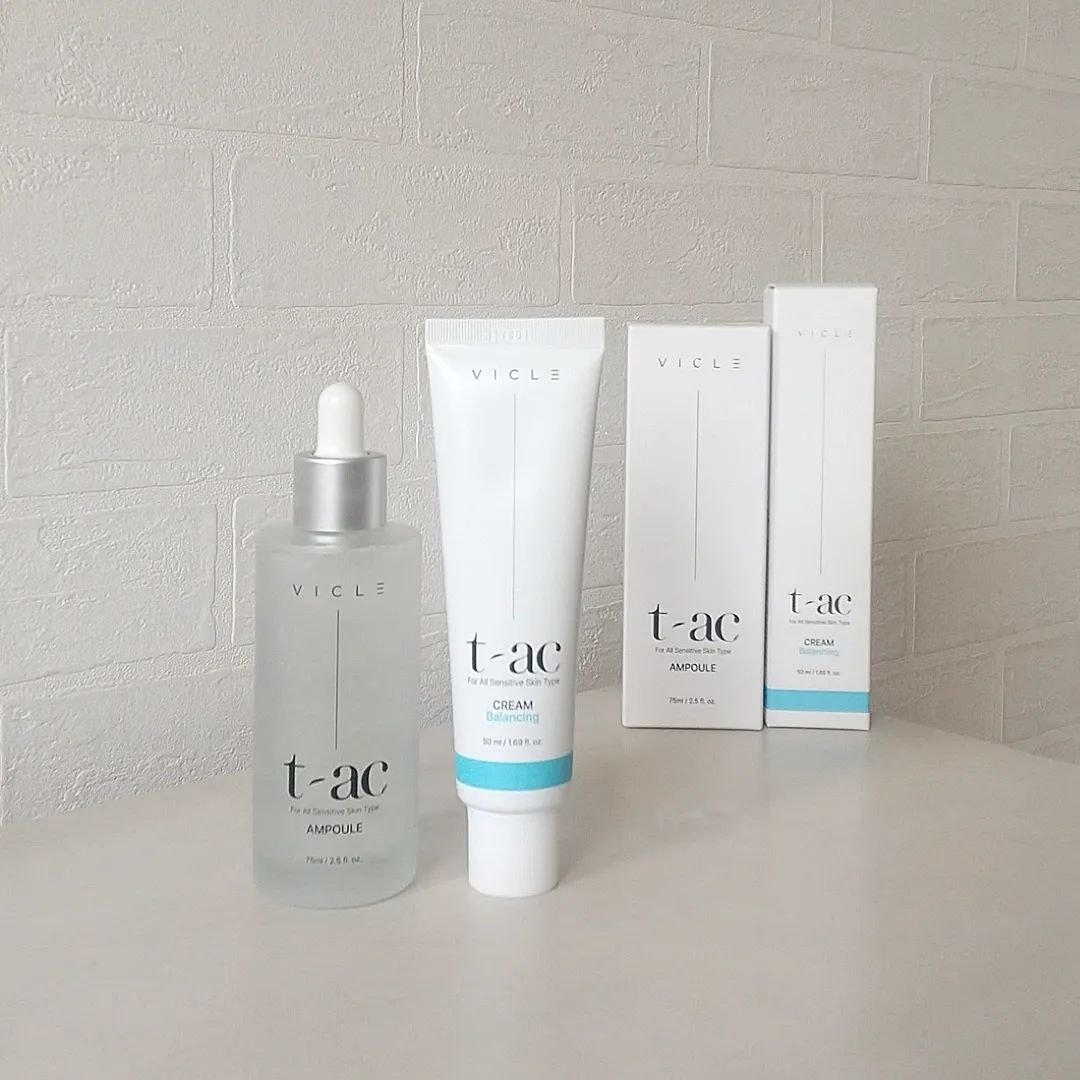 トラブル肌向けのスキンケアが揃う、VICLE🇰🇷 韓国で22万本の大ヒットを誇るモイスチャーアンプル&クリームを使ってみました T-AC 7 COMPLEX™(7種の植物由来成分)を配合 カミツレ花エキス、スベリヒユエキス、ハマメリスエキス、トウキンセンカ花エキス、アロエベラ葉エキス、ティーツリー葉エキス、トレハロース どちらのアイテムも水分たっぷりで肌表面だけでなく内側からしっかりと保水しやさしく鎮静してくれる感じがしました