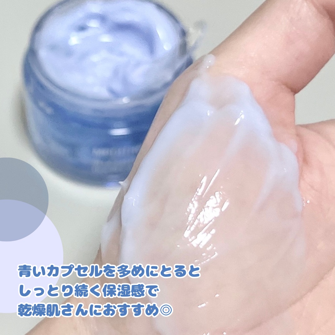 透明の水分ジェルと青い水分カプセルの 2種類のテクスチャーで 長時間保湿してくれる 2重密着モイスチャークリーム✨ 透明な水分ジェルを多めにすると 水分感たっぷりで インナードライさんにピッタリ。 青い水分カプセルを多めにすると すっごくしっとりして 乾燥肌さんにもおすすめ◎