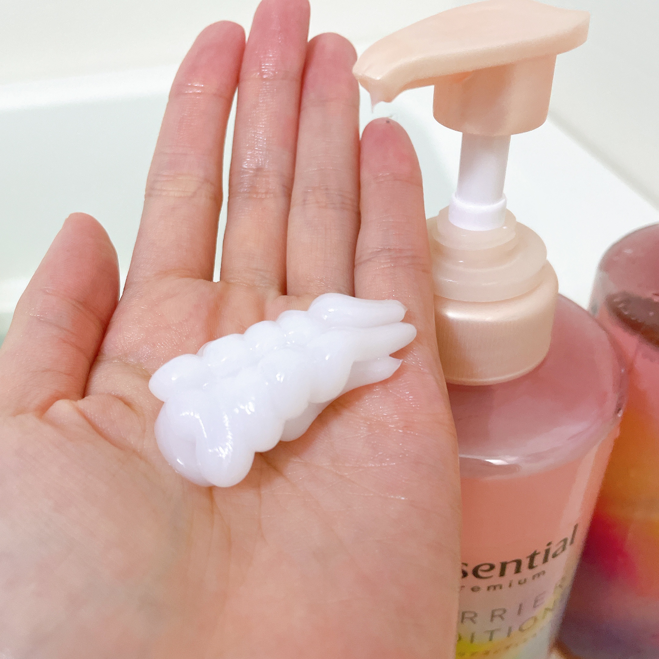 ♡エッセンシャル♡エッセンシャルプレミアムバリアシャンプー・コンディショナーシルキー&スムースシャンプーはふわふわ泡立ちが良く、全体的にピーチの香りに包まれとても幸せな気分になりました🍑コンディショナーをすると指通りがつるんと全体的なまとまり...