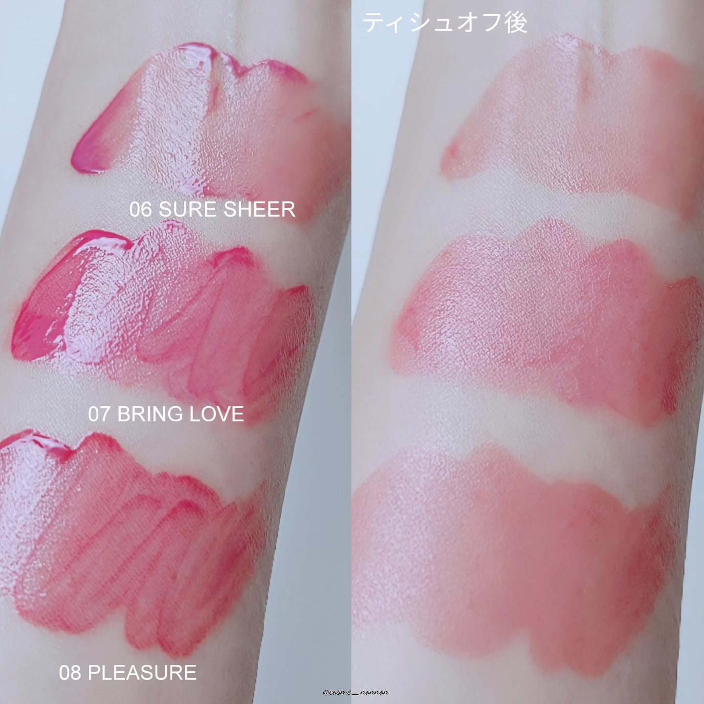 シルクのような、なめらかな塗り心地 ティント効果で色ツヤが長持ちする* ハート型の可愛いぃセミマットティント 私が使ったカラーは03 ルビーレッド❤ 青みのある鮮やかなレッドカラー オイルが配合されているのでスルスル塗れて乾燥しにくく発色もよくツヤも出て軽い塗り心地でした* 飲食してもしっかりとカラーが残ってました*