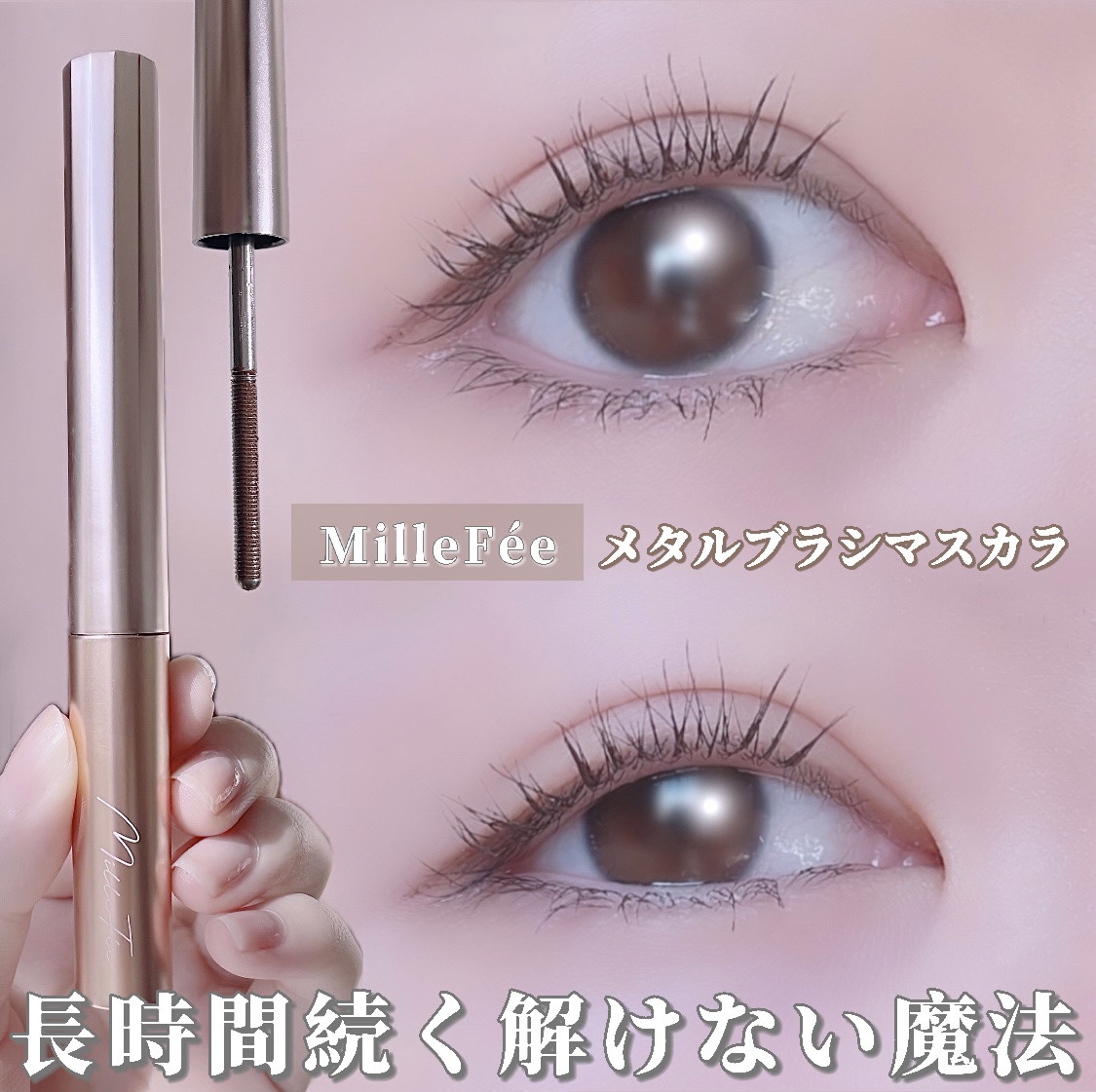 - 360°メタルブラシでまつげの毛流れを整えて、束感まつげを簡単メイク! 自まつげが伸びたように自然にロング&ボリュームアップし、美しい上向きまつげを長時間キープ! <メタルブラシで、長時間続く解けない魔法> ロングエクステファイバー配合でまるで長い自まつ毛のような仕上がり。 水・汗・こすれに強く、キープ力が持続して時間が経っても可愛い目元に。 ■メタルブラシのポイント 360°のメタルブラシに均一にマスカラ液が付く、MilleFéeのこだわり設計。 そのためまつ毛に塗りやすく、ダマになりにくく綺麗なセパレートまつ毛が簡単に完成します。 またマスカラ液にはファイバーを配合し、自然で長いまつ毛に見せてくれる効果も。